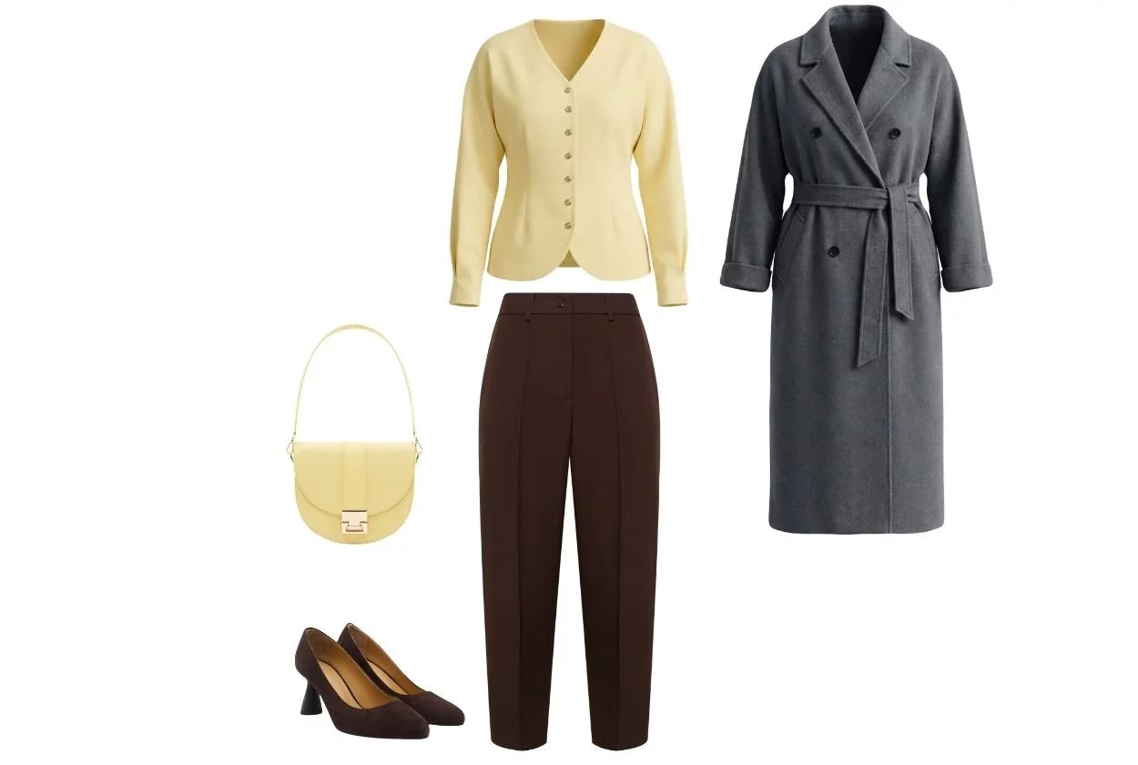 Как собрать: жакет с объемными рукавами сливочно-желтого + брюки-сигареты в оттенке горький шоколад. Сверху — графитовое пальто (наша супербаза). Обувь — шоколадные лоферы или туфли. Сумка — в тон или как маленький акцент.
