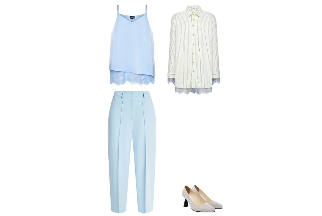 Как собрать: голубые брюки + свободная рубашка в полоску + топ. Обувь — туфли молочного или голубого цвета.