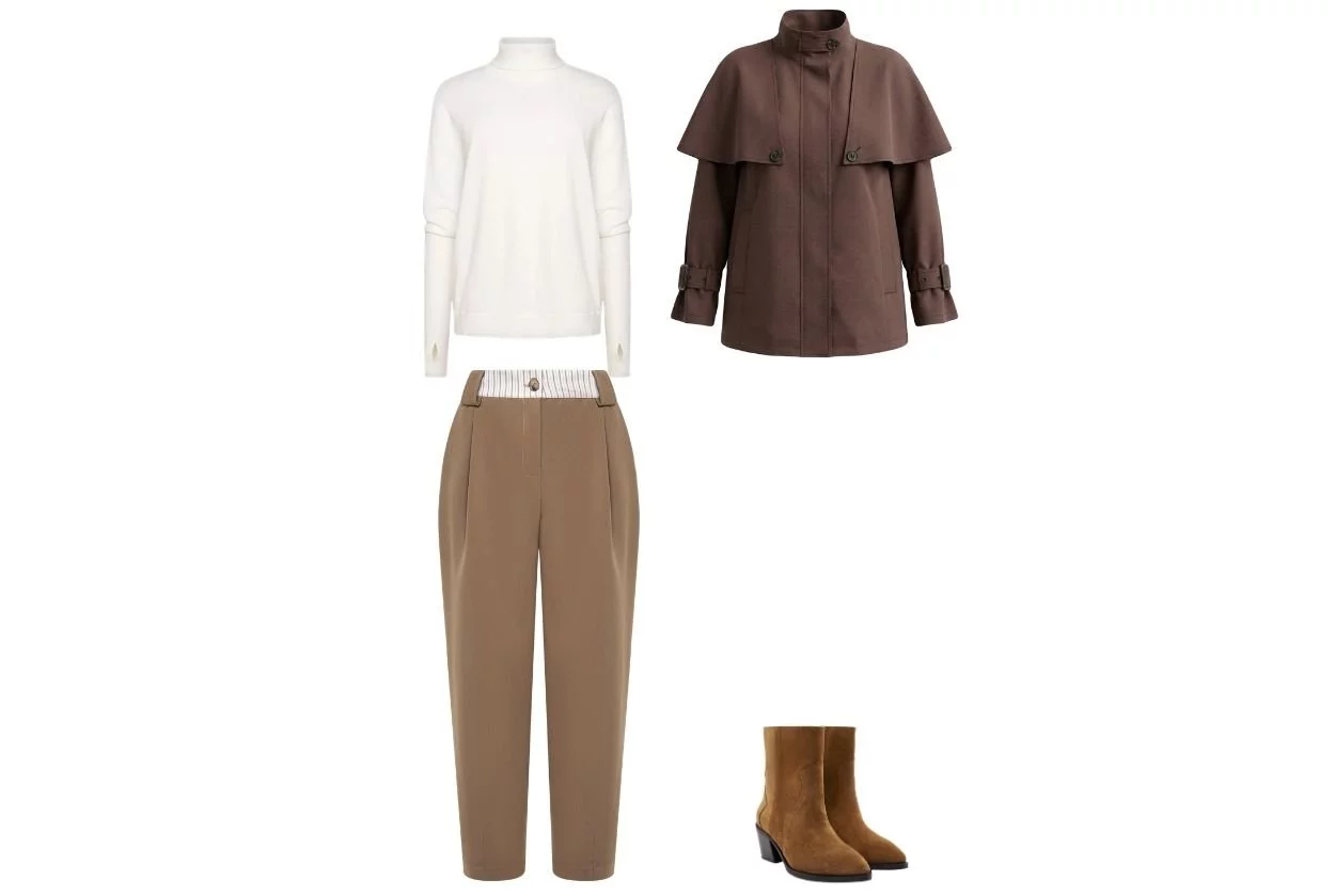 Как собрать: укороченный тренч кофейного оттенка из новой коллекции Дыхание + молочный бадлон + брюки.