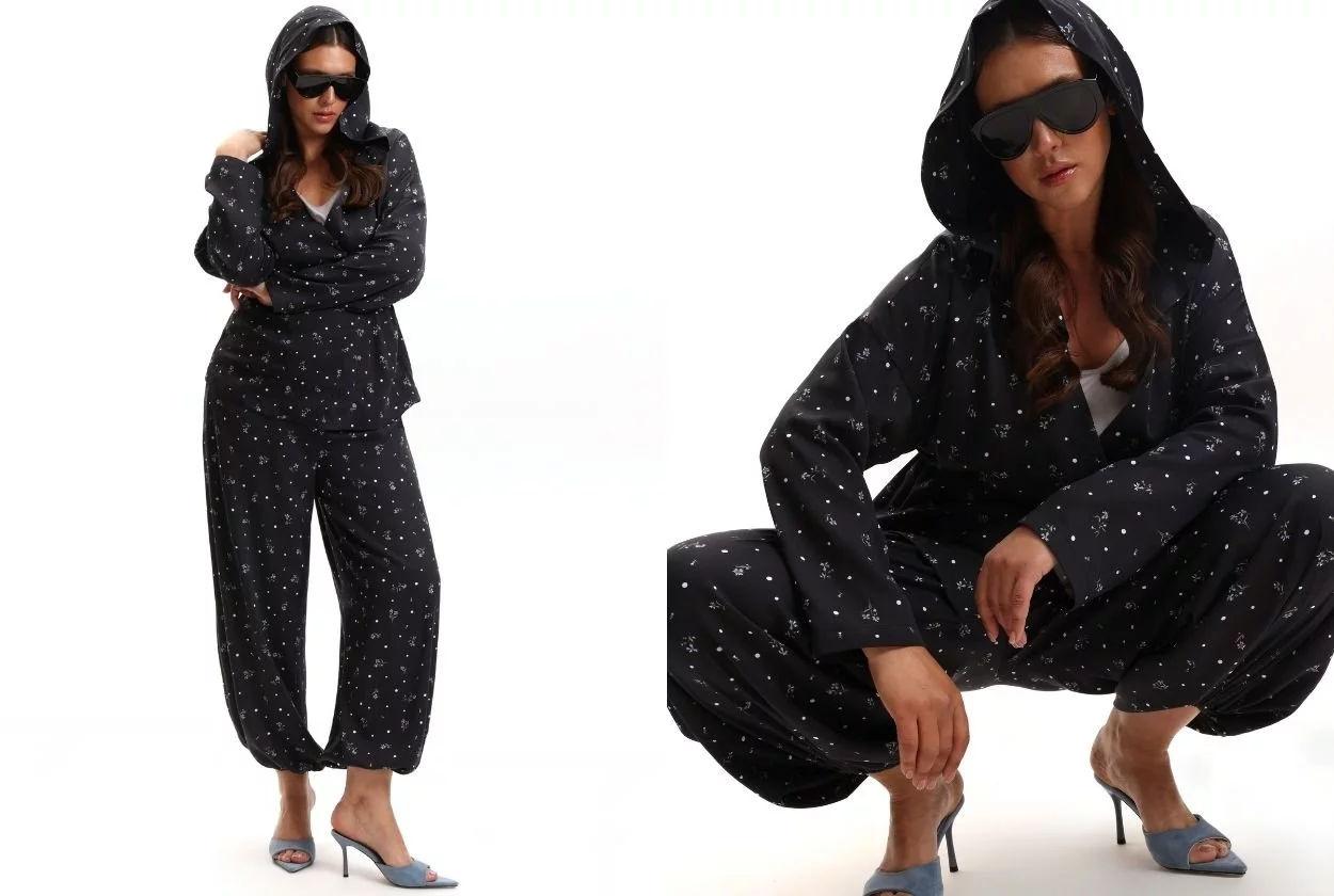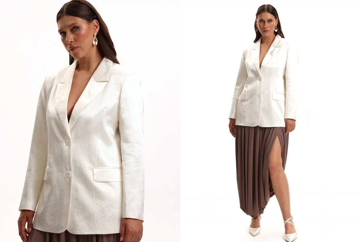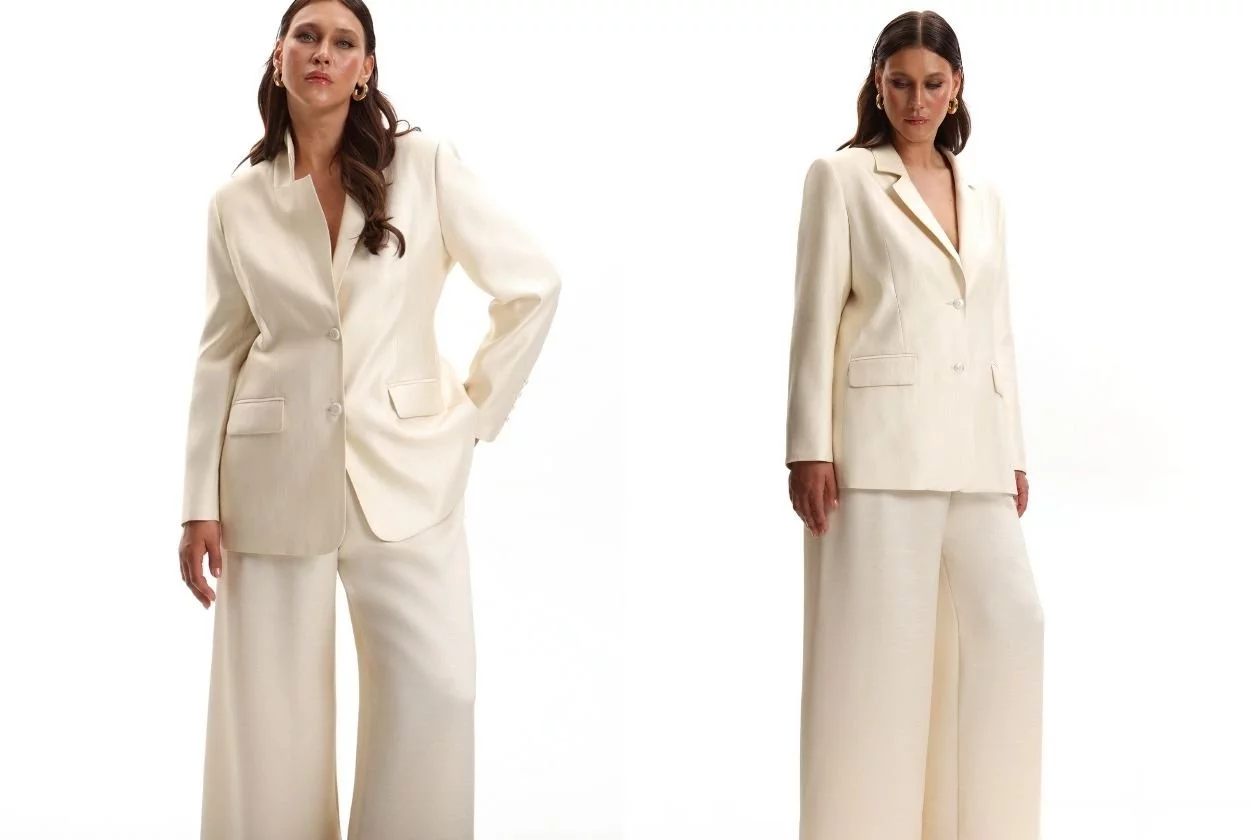 Также в капсулу мы включили жакет из жатой поливискозы с блестящей вуалью. Эта фактура не только выглядит необычно и дорого, но и не требует глажки — идеальный вариант для тех, кто много путешествует, выступает на сцене или просто не хочет тратить время на глажку. Жакет держит форму и смотрится очень свежо!