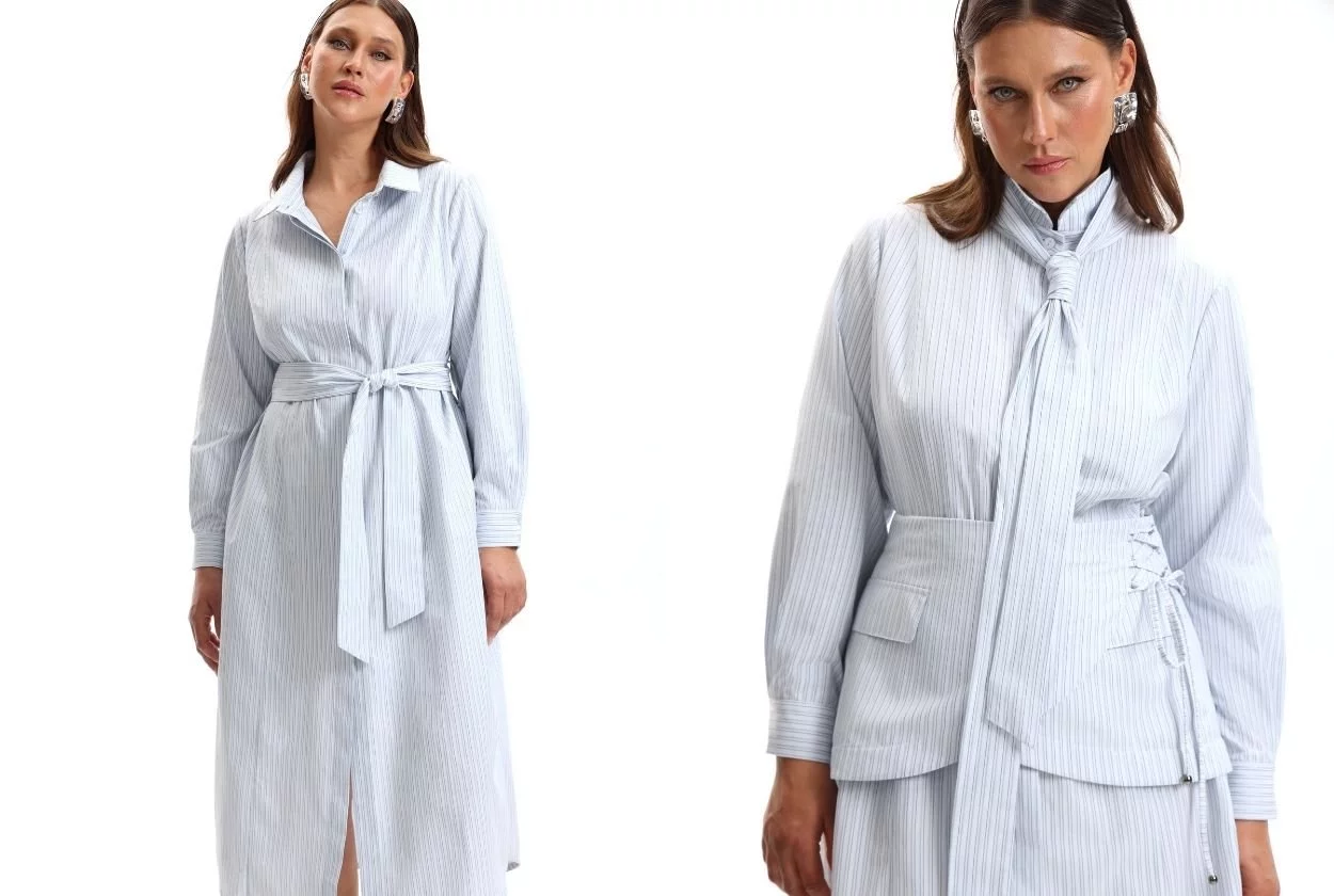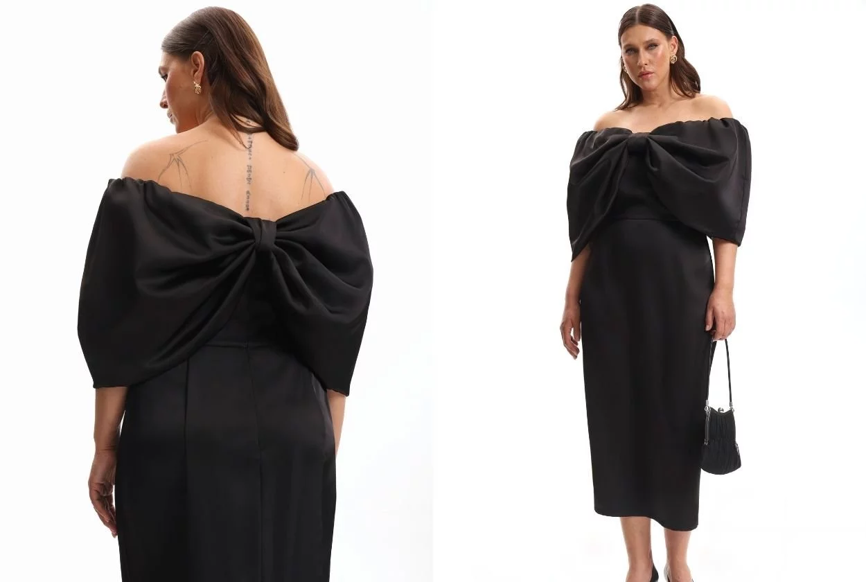 Есть в коллекции Свечение и более интересные варианты. Один из них — уже знакомый вам фасон с огромным бантом, но на этот раз в черном цвете. Элегантно и очень красиво! Платье подчеркивает силуэт, но не сковывает. Другой — платье-рубашка со съемным поясом-баской — находка сезона. Днем это лаконичная рубашка-платье для офиса, а вечером, когда вы пристегиваете баску — перед вами уже нетривиальный образ с игривой ноткой. Два в одном, и все варианты прекрасны.