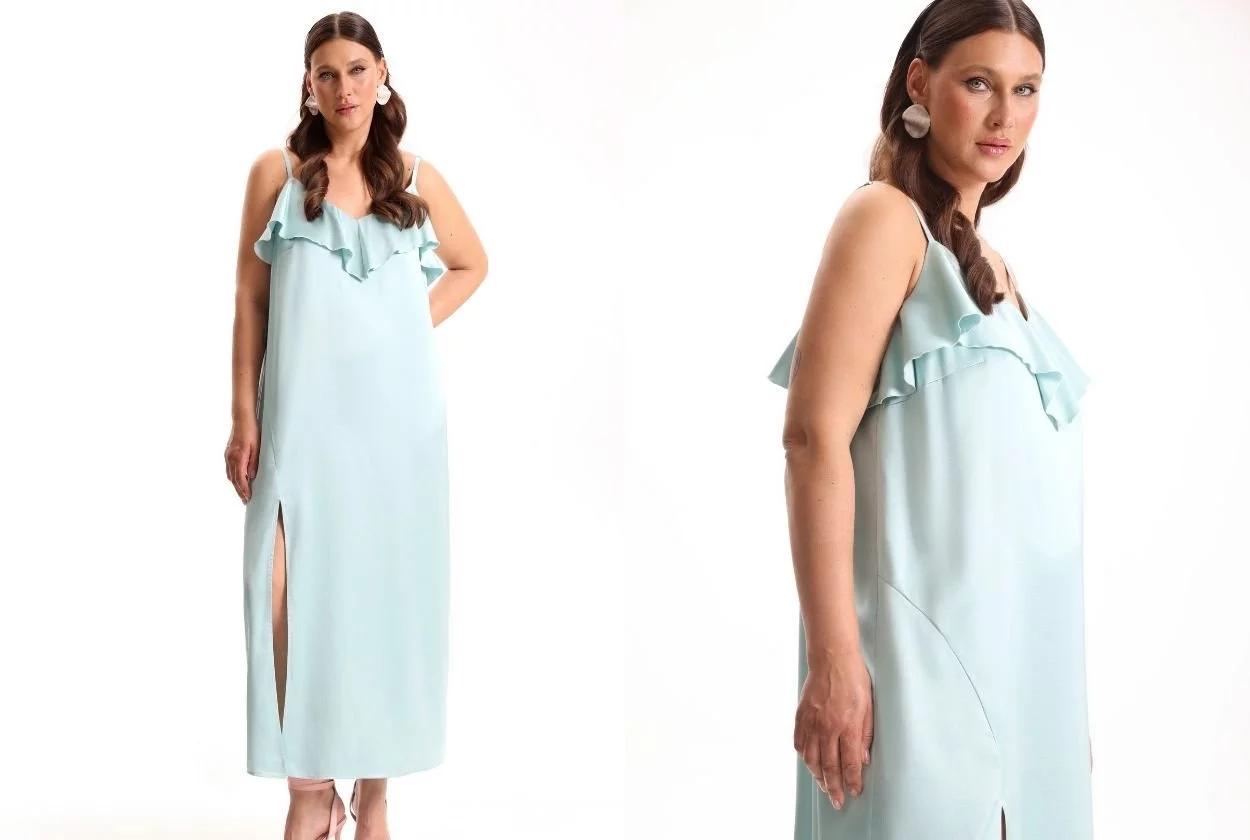 Платье слинки в оттенке мята — особенная любовь и к фасону, и к цвету. Изумрудные, мятные и бирюзовые оттенки порой недооценивают. Но не мы. Искренне обожаем эту палитру и считаем ее необходимой в летнем гардеробе. Платье мягко облегают тело, струится, а воланы добавляют движения и объема там, где нужно.