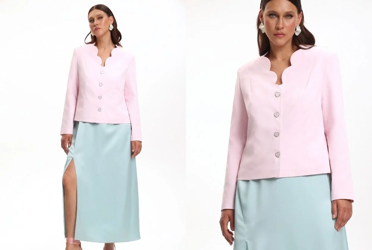 Еще один важный акцент верхней части коллекции — жакет с фигурным бортом. Он напоминает лепесткок от нежного распустившегося пиона, образуя архитектурную деталь. Такой жакет преображает даже самый простой низ.