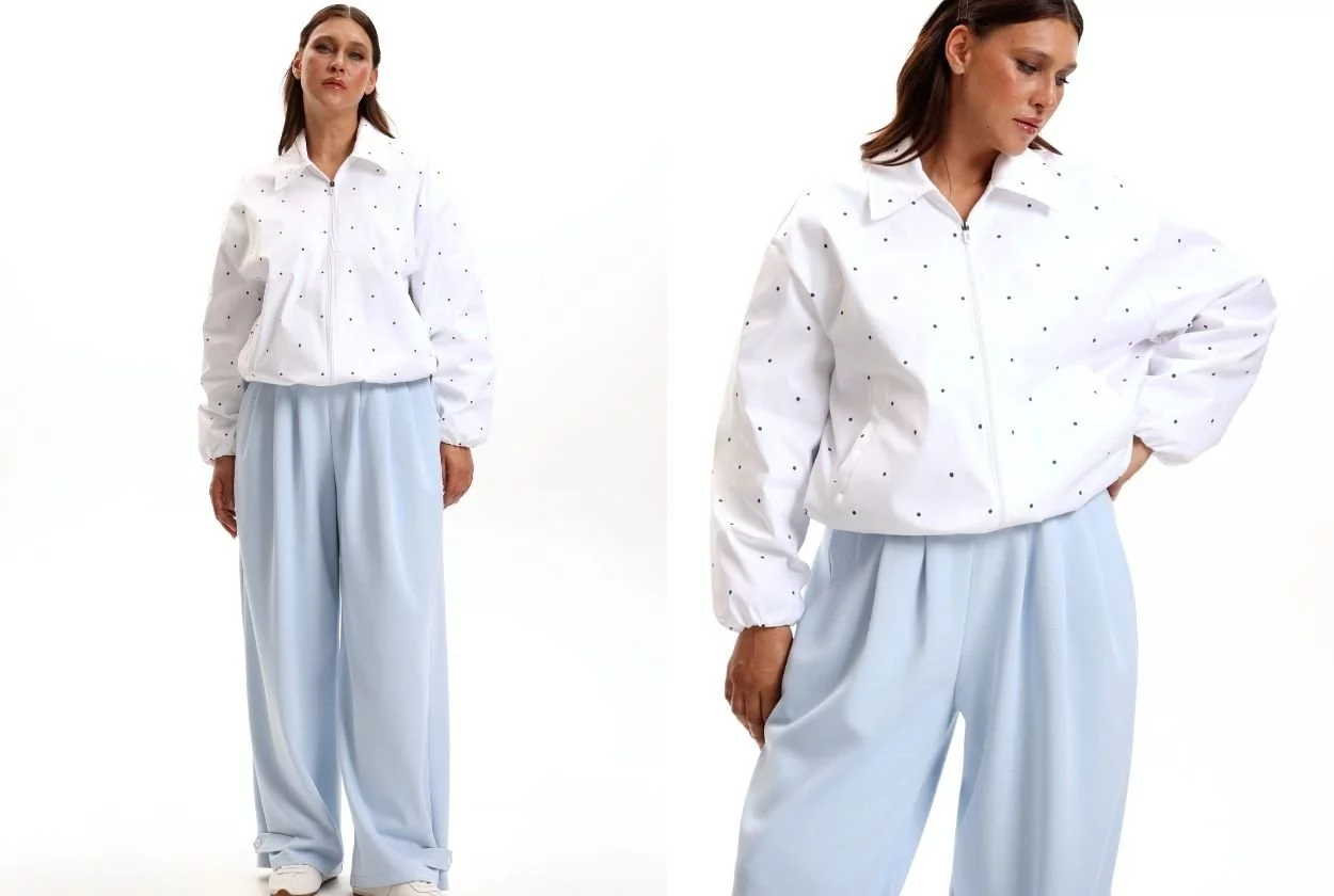 На «сладкое» мы оставили еще пару позиций. Бомберы Конрад в алом оттенке и в мелкий горошек станут незаменимыми в верхнем гардеробе. Они универсальны по стилю, длине и комплементарно смотрятся с базовыми джинсами, спорт-шик костюмом и воздушными платьями.
