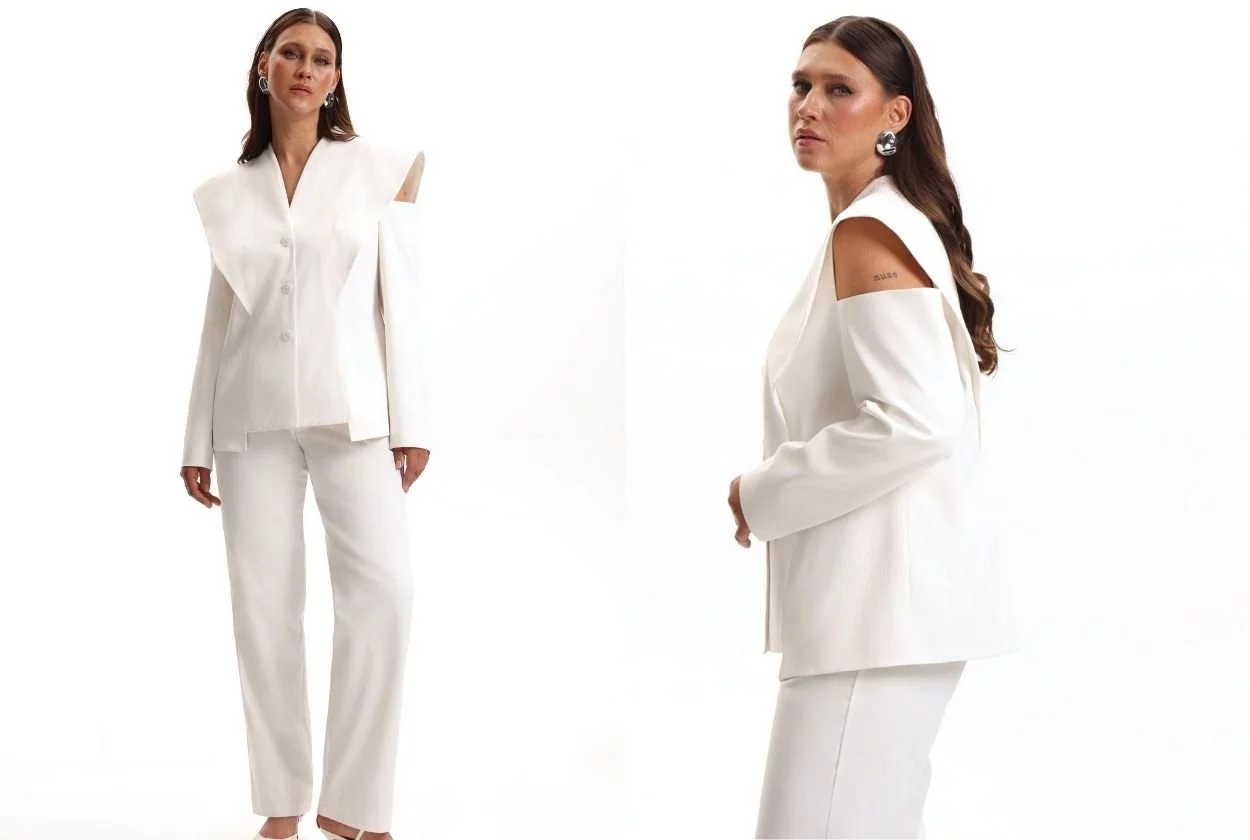 Жакет с открытым плечом в маскулином стиле
