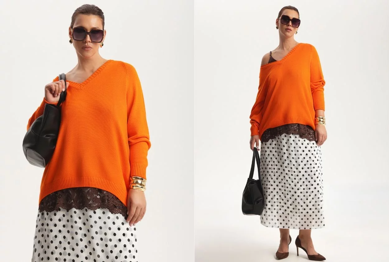 - Апельсиновый оттенок: заводной, игривый. Он появляется в виде мягкого джемпера, который вкупе с юбкой в горох и кружевным топом мгновенно согревает образ.