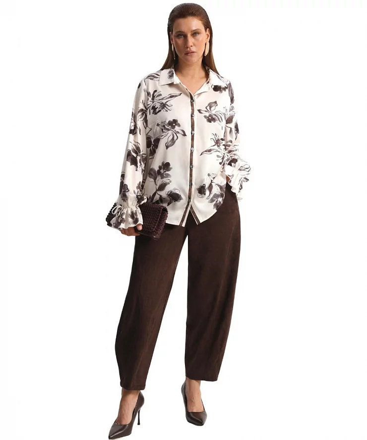 - Основа: приталенное миди-платье или блузка с асимметричным цветочным принтом в дуэте с брюками.