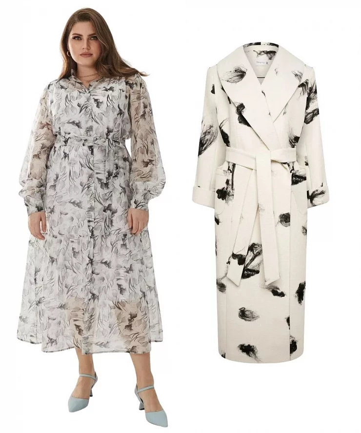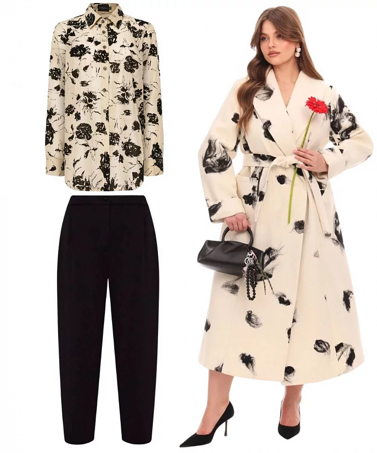 - Основа: свободное платье с воланом или нежная блуза с брюками в миксе с пальто с текстурированным принтом.