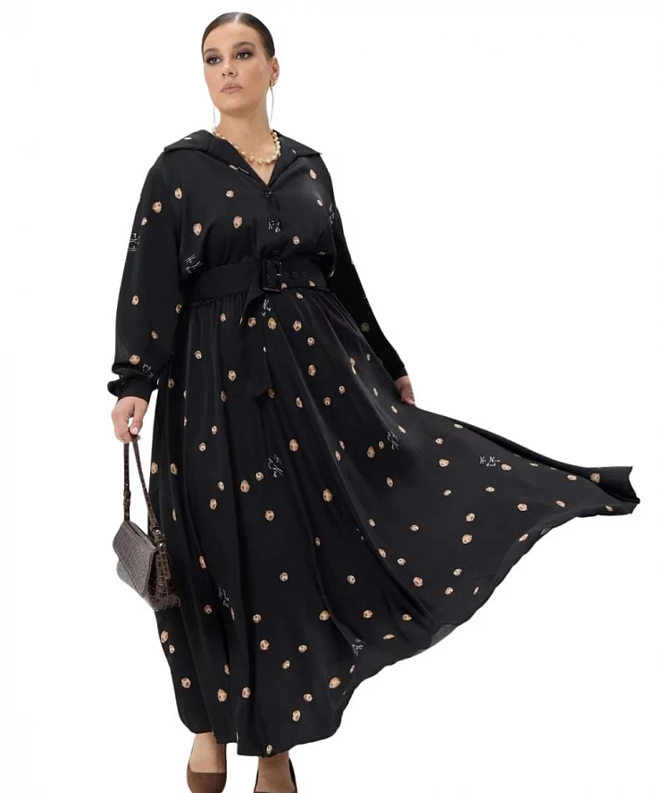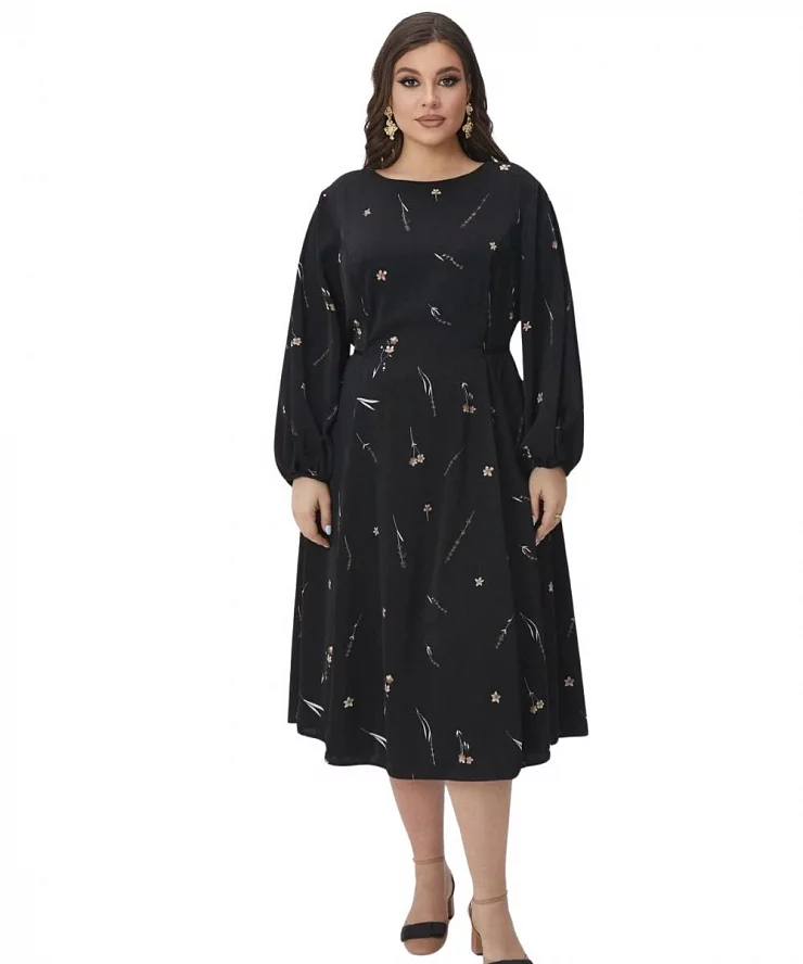 - Основа: черное платье с ненавязчивым принтом, которое становится главным фоном для цветочной аппликации по всему пространству платья.