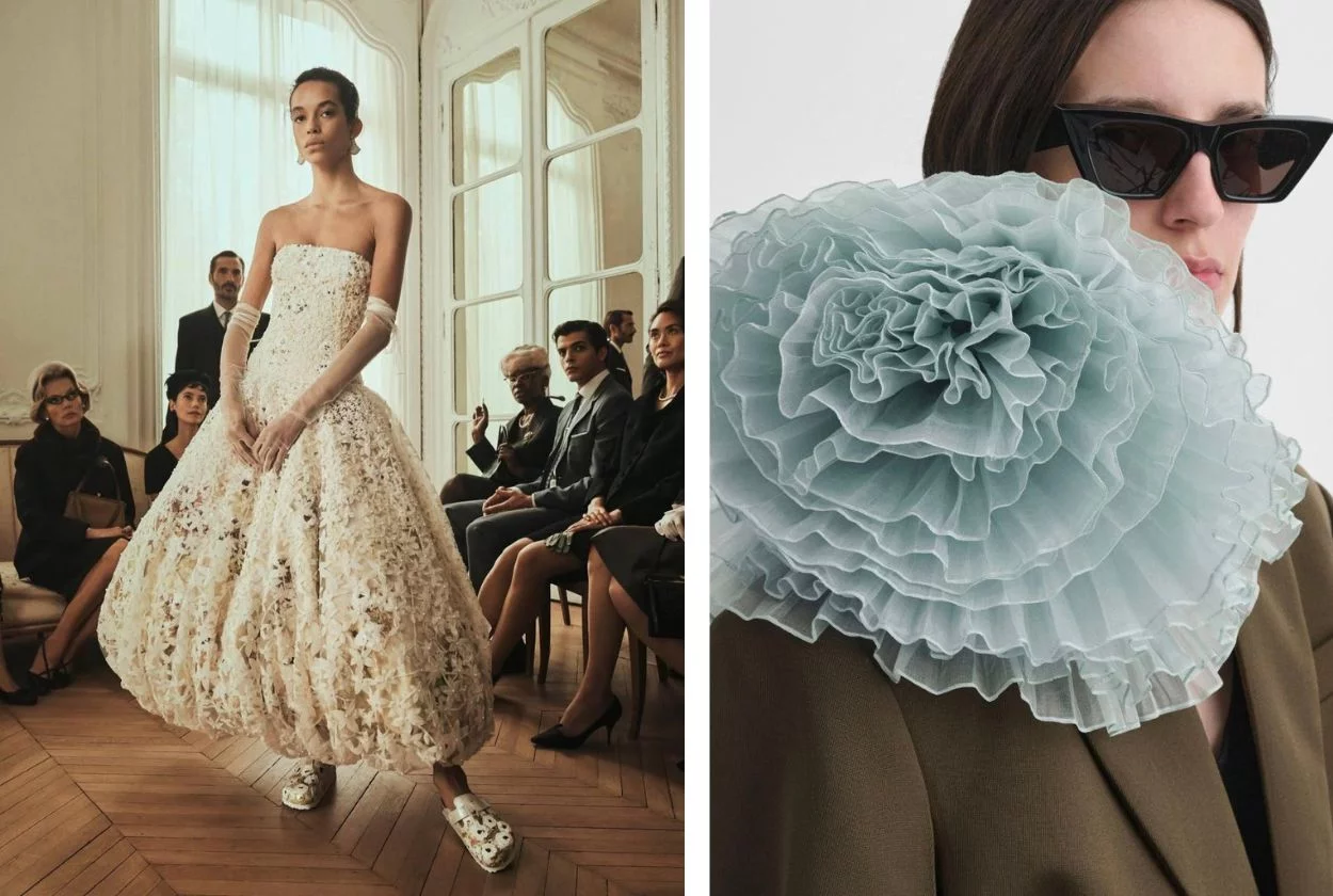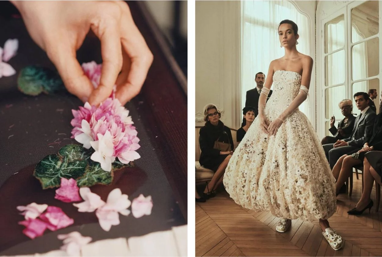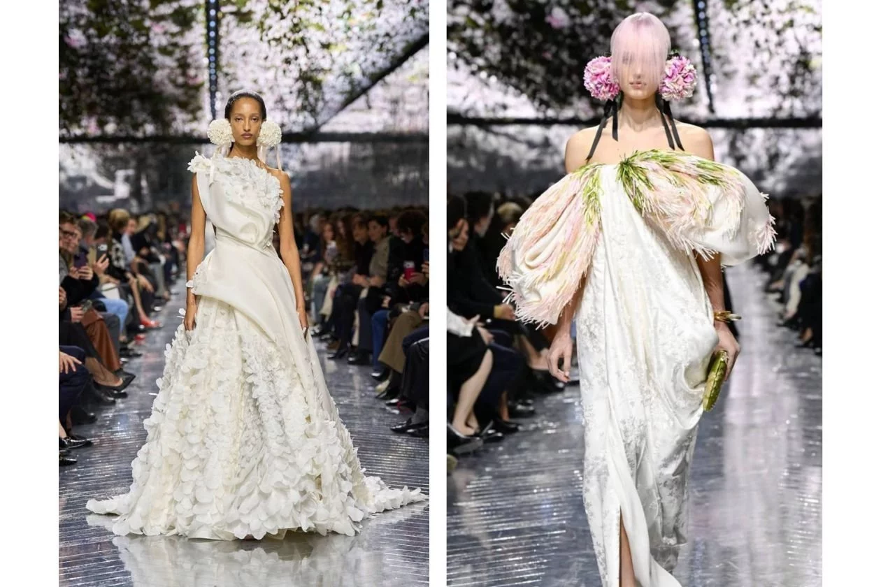 Эти мотивы и выразительность прослеживаются в новом нашумевшем показе Dior Haute Couture SS26, основными элементами которого являются платья с кружевом, вышивкой и жемчугом, а главными акцентами — крупные цветы-серьги. Коллекция стала настоящим манифестом цветочного возрождения, где цветок использован не только как украшение, а как основополагающий принцип.