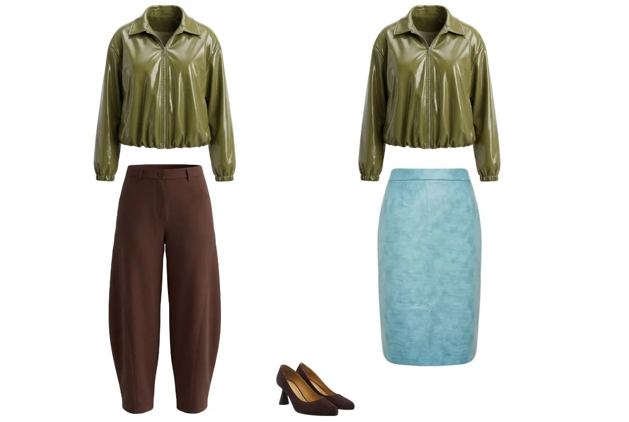 Благородство и сдержанность. Лакированная кожа в сочном лаймовом оттенке гармонично смотрится со спокойным коричневым. Образ получается не скучным, а динамичным за счет фактуры и бликов.