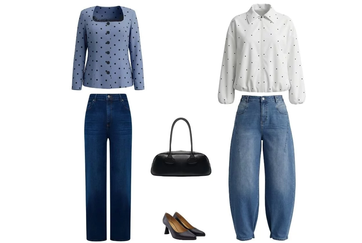 Горох будет классно смотреться с однотонными вещами, плотным денимом. Подходящая к такому луку обувь на устойчивом каблуке дополнит идеальный аутфит для городских прогулок.