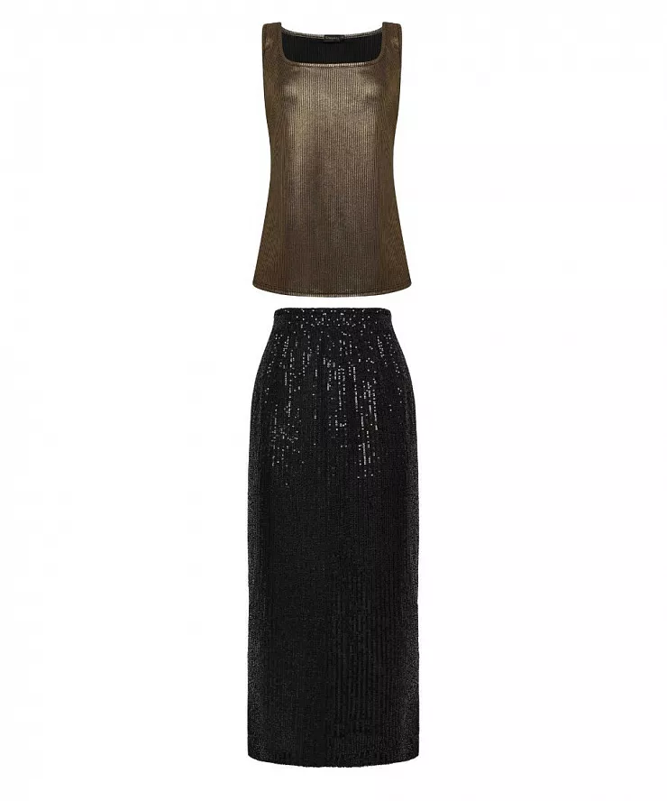 - Блестящий топ в рубчик + юбка. Золотой топ из плотного хлопка в рубчик, надетый с черной юбкой миди с пайетками — это рецепт современного, непринужденного шика. Выглядит дороже и сложнее, чем простое платье.
