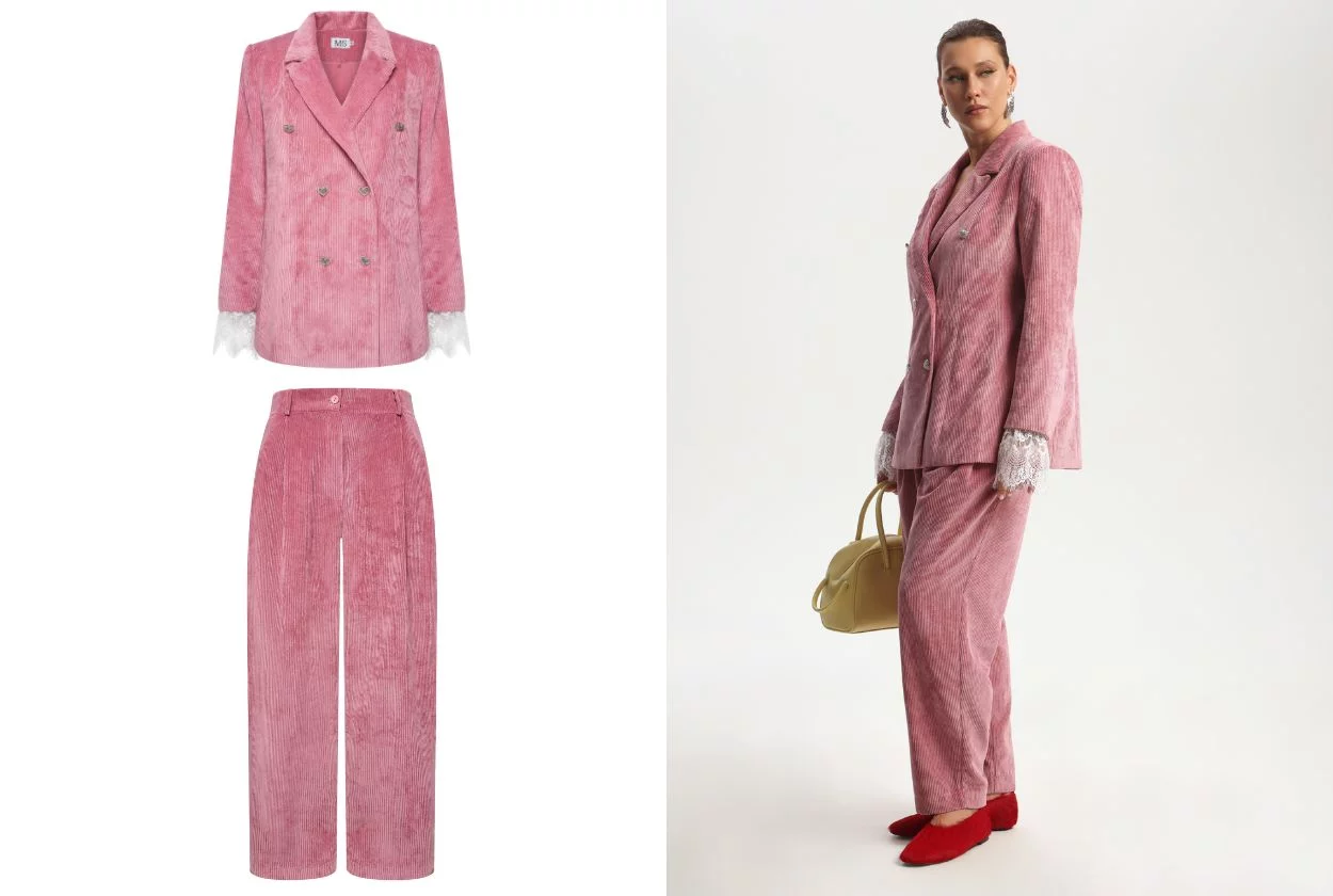 - Костюм-двойка (брюки + жакет) расслабленного кроя в розовой пудре или шоколаде. По сути, даже 2 разных по подаче костюма могут разнообразить и насытить гардероб.