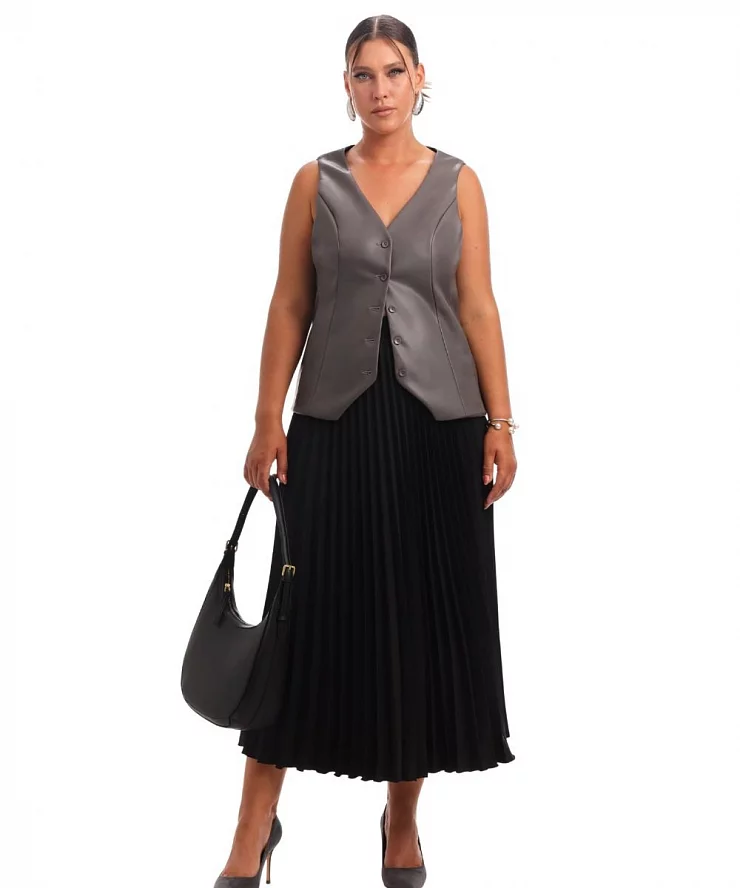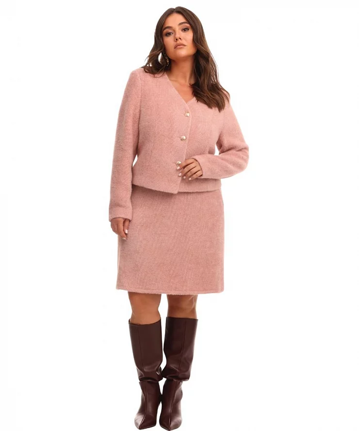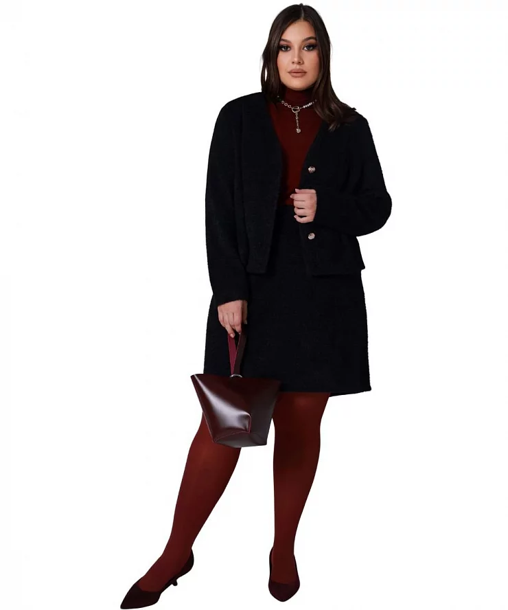 - Эффект: собраный, современный, чувственный образ, где строгость смягчена фактурой и цветом.