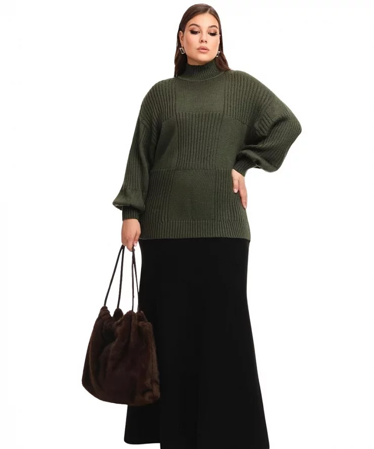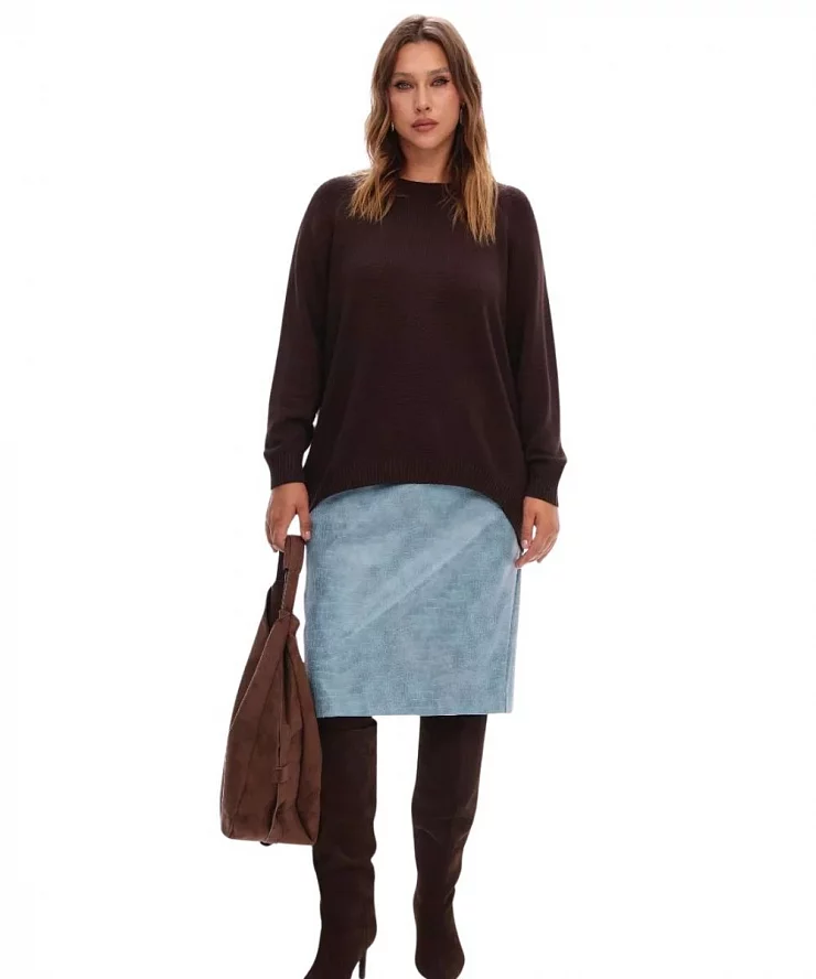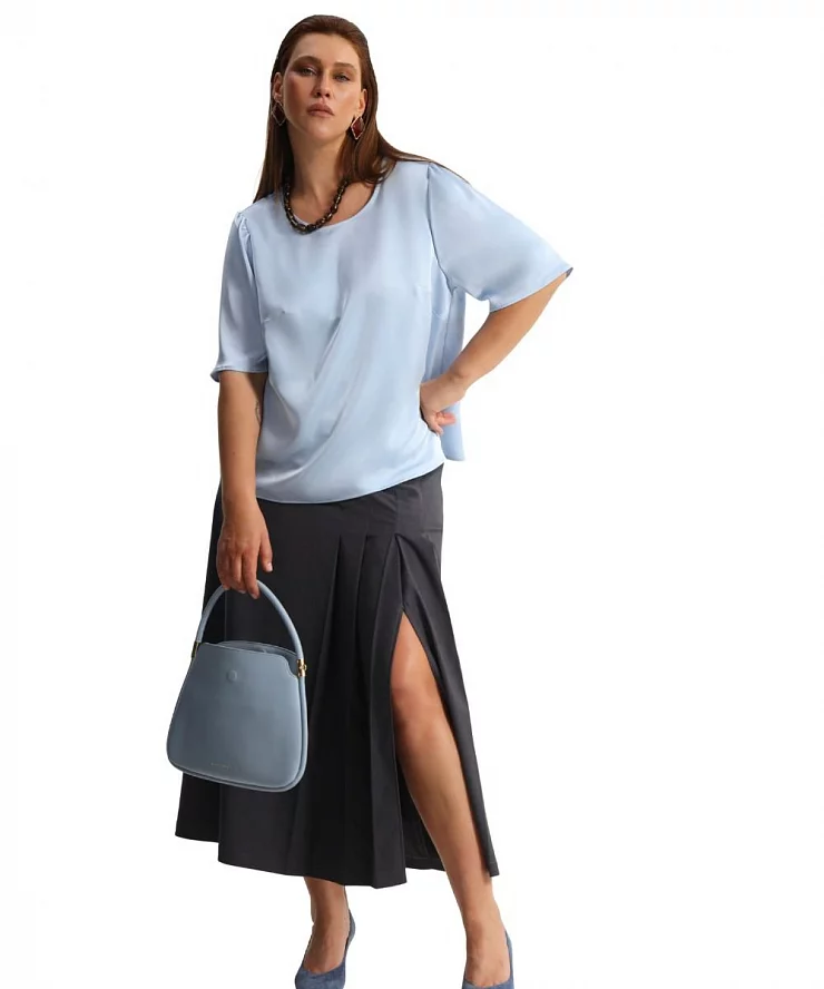 - Верх: объемный джемпер, кашемировая водолазка или шелковая блуза.