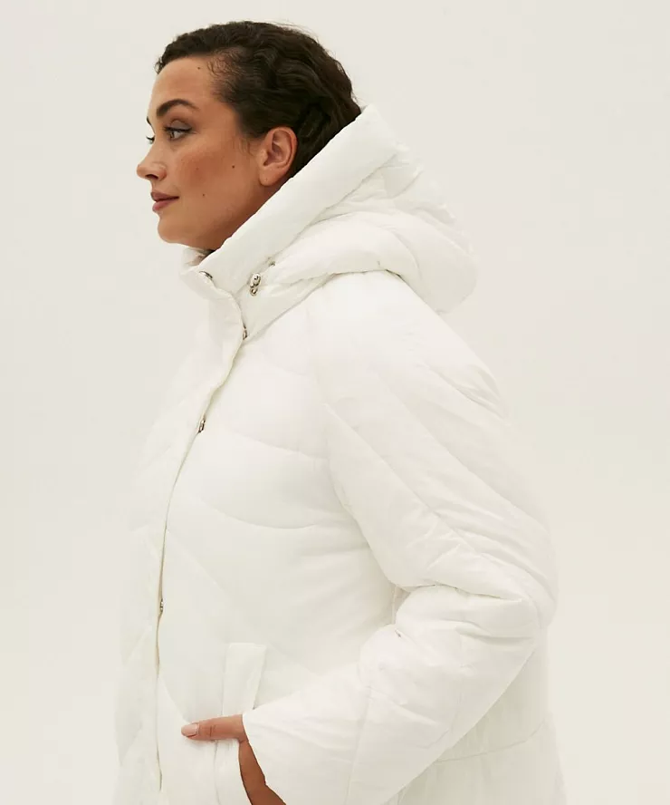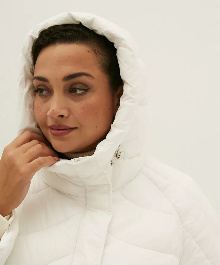 Кстати, молочные оттенки также актуальны зимой. Можете слиться воедино со снежной красавицей-зимой или почувствовать себя настоящей Снегурочкой в нашем длинном пуховике прямого кроя. Пуховик имеет капюшон и длину миди, что немаловажно.