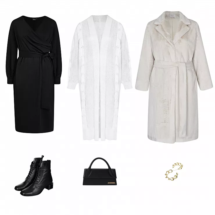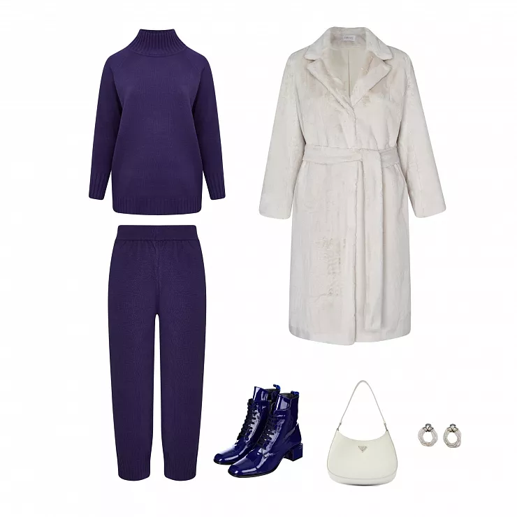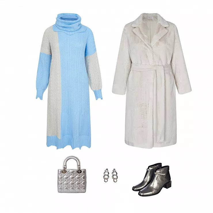 Образ, в котором хочется пойти в театр, музей или на выставку. Он романтичный, но в то же время очень удобный - трикотажное платье и вязаный кардиган говорят об этом сами за себя. Ботильоны на каблуке придадут женственности, а меховое пальто сверху - немного роскоши. И вы отлично впишетесь в атмосферу культурного заведения, которое выбрали!