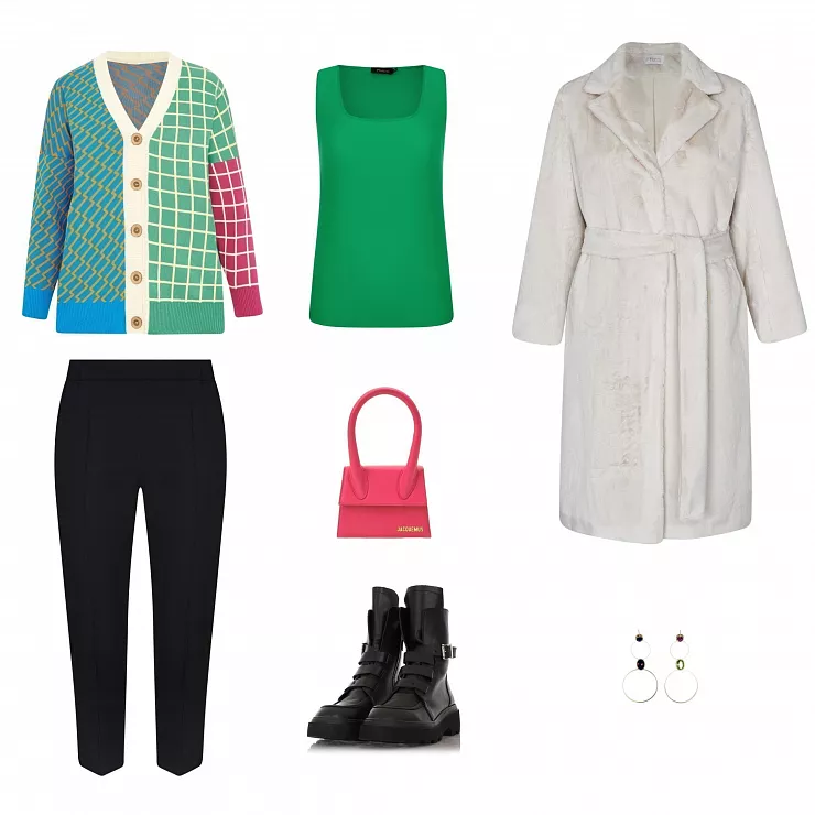 В таком образе хочется общаться, веселиться, делиться идеями, работать, создавать что-то. Почему? Потому что он невероятно комфортный и в то же время сочетает в себе яркие оттенки, которые быстро поднимут настроение вам и окружающим. Наш знаменитый кардиган с геометрическим принтом предлагаем стилизовать с зеленым топом, черными брюками и массивными ботинками. Сверху, конечно же, наше меховое пальто, и не забудьте про золотистые украшения! Ведь стиль - в деталях :)