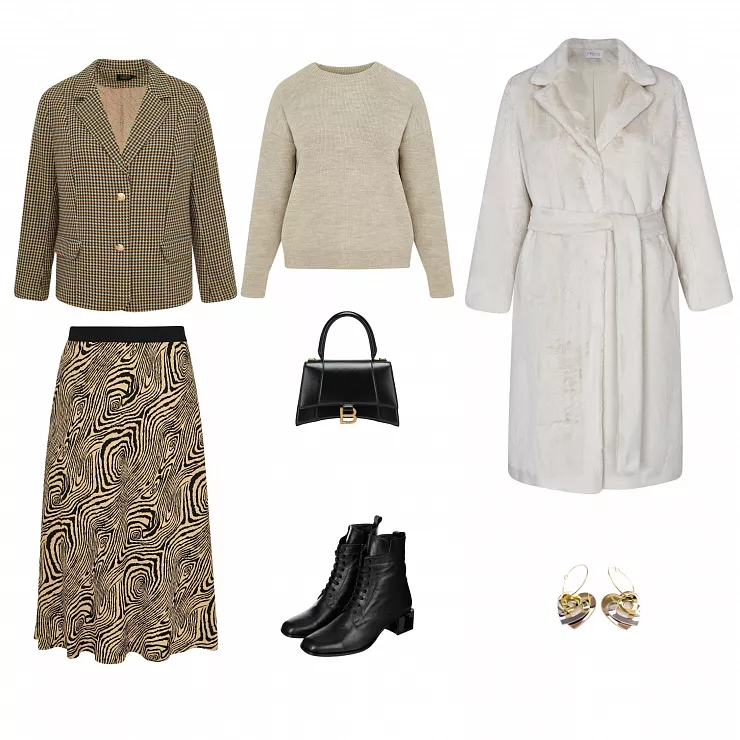 Образ для тех дам, которые даже в холодную погоду не готовы отказываться от стиля "GIRLBOSS" :) Юбка и пиджак в аутфите есть обязательно, а чтобы утеплить его - добавим свитер под пиджак. Сверху меховое пальто, на ноги - ботильоны, и вы неотразимы!