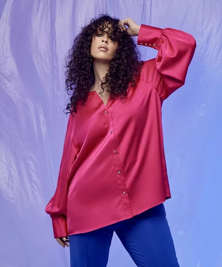 Рубашка выполнена из смесовой ткани с фактурой шелка, имеет свободный силуэт и длину миди, спереди золотые пуговицы. Рукав «фонарик» придает некой торжественности, поэтому собрать торжественный (или даже базовый) образ не составит труда!