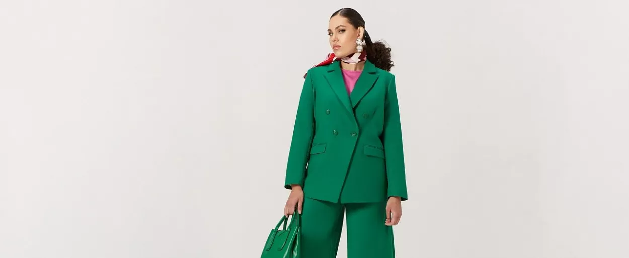 Сегодняшняя новинка – костюм в сочном изумрудно-зеленом оттенке с брюками палаццо.