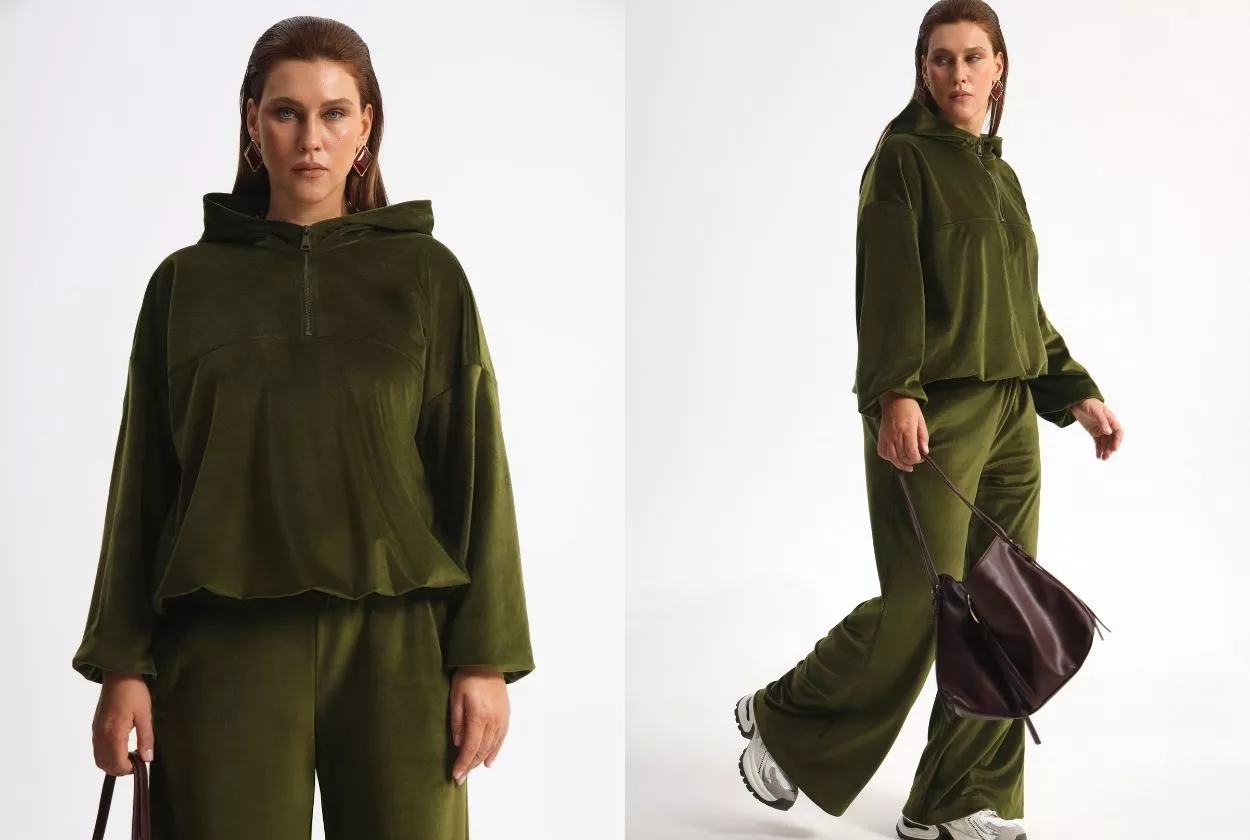 Свитшот из экозамши с актуальными в этом сезоне брюками-баллонами