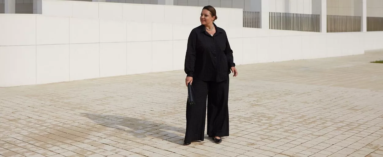 - актуальная длина брюк макси для эффекта длинных ног;