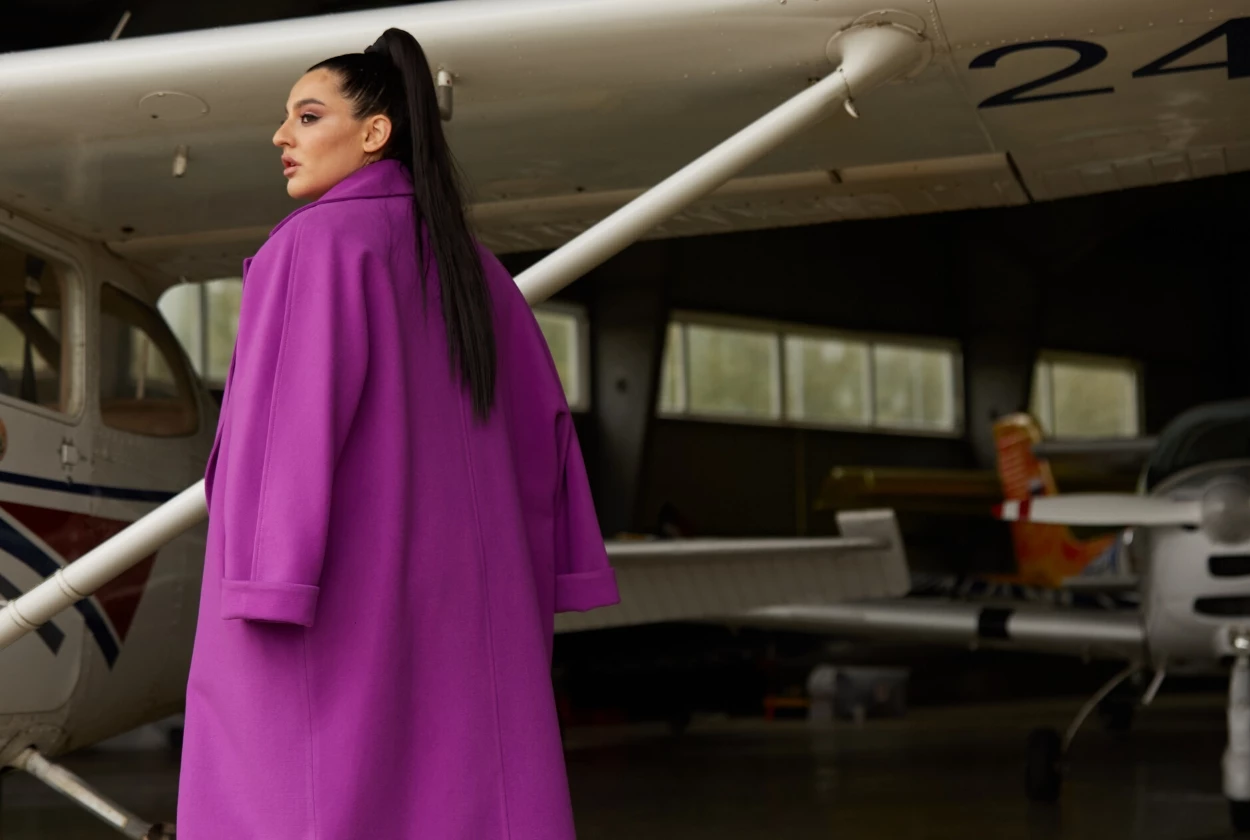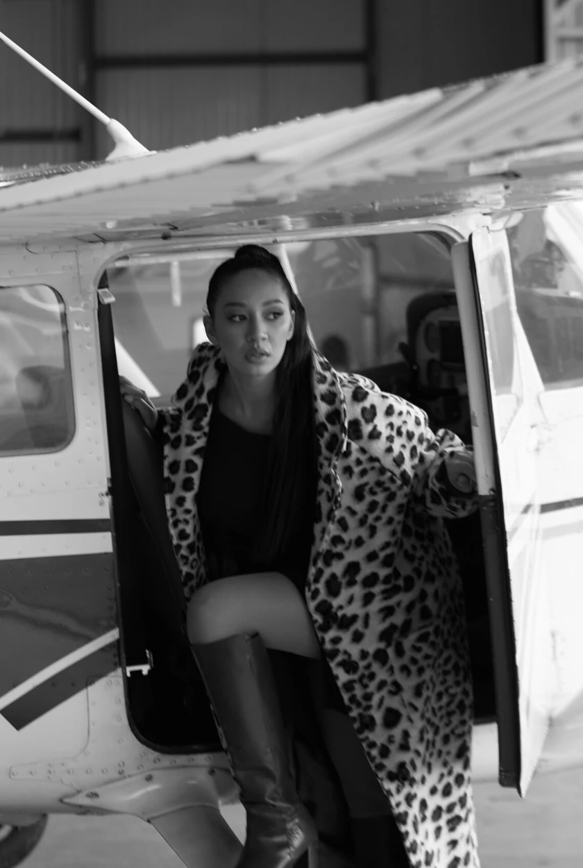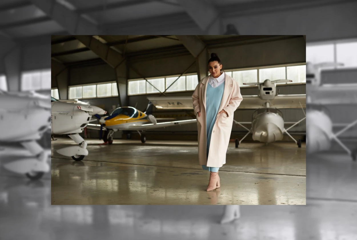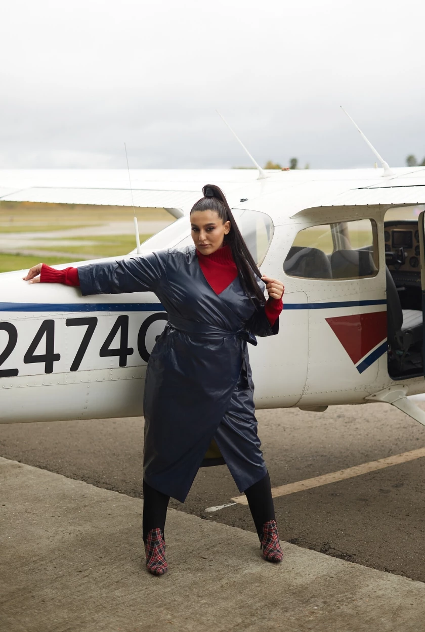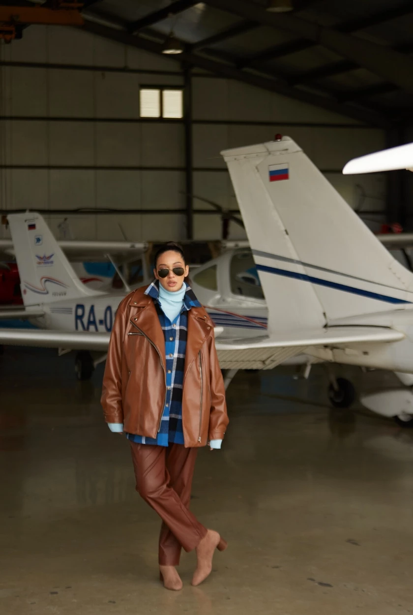 Мы давно думали о съёмке на аэродроме, и, наконец, у нас получилось это сделать. Был пасмурный осенний день. Вся команда работала не покладая рук и, немножко дрожа от холода, изредка тянулась к чашечке горячего кофе, чтобы немного согреться. Вертолёты были прекрасны – атмосфера аэродрома на контрасте подчеркнула уют и женственность наших новых образов.