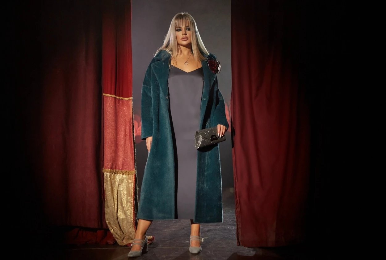 Пальто халат из экомеха в оттенке малахит