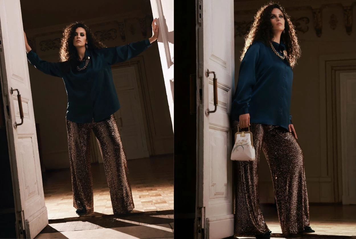 Палаццо с пайетками в оттенке бронза и подкладкой