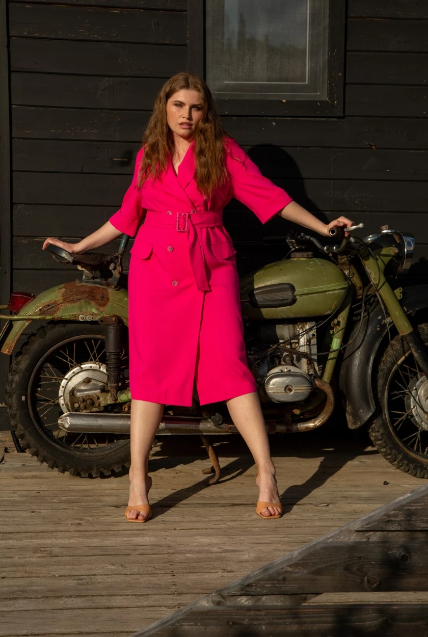Двубортное платье в оттенке фуксия с коротким рукавом