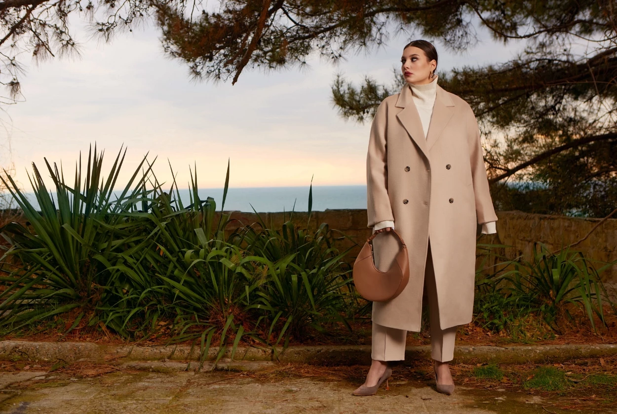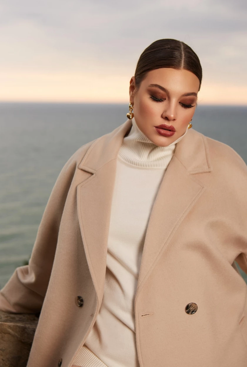 Двубортное пальто из шерсти с ворсом в молочном оттенке