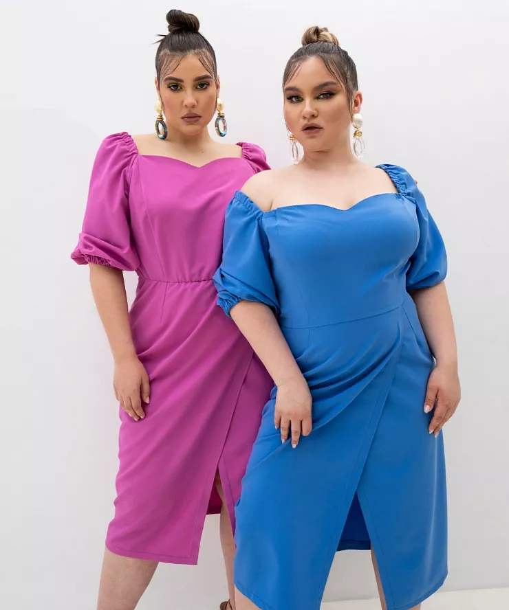 Платье с запахом и фигурным вырезом голубого цвета