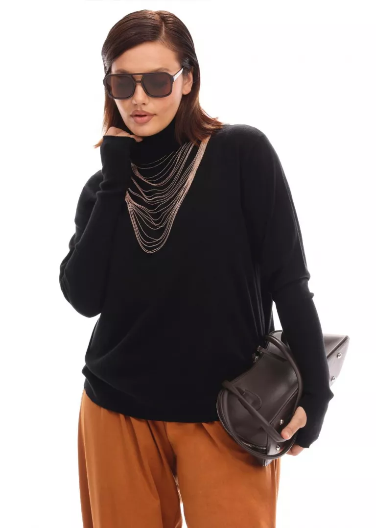 Водолазка бадлон оверсайз из смесовой вискозы. Длина до середины бедра. Горловина гольф с разрезом и вышивкой сзади. Рукав длинный, на длинной зауженной манжете с отверстием для пальца, пройма широкая.