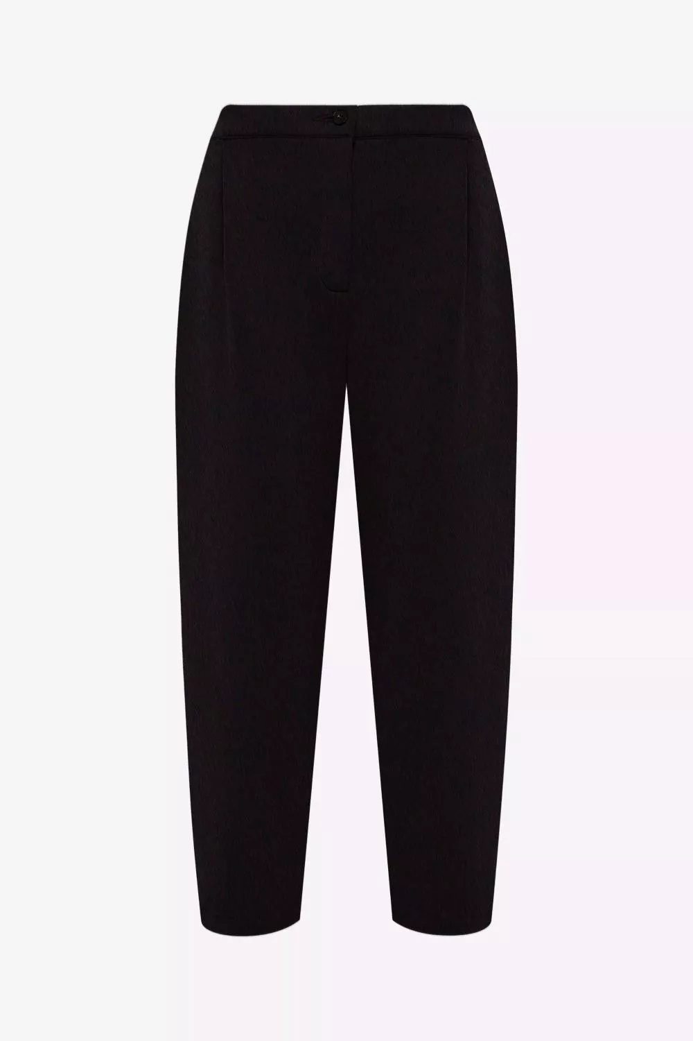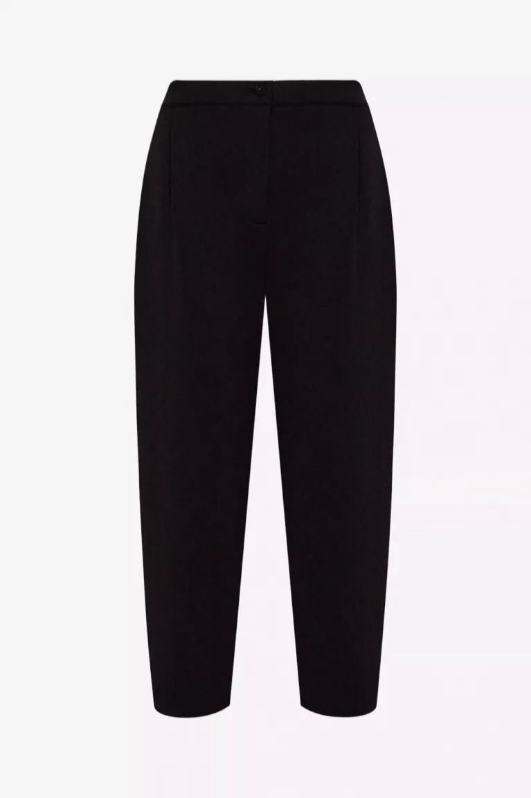 Брюки бананы из поливискозного бархата с защипами. Пояс на резинке сзади, застежка молния, посадка высокая. По бокам карманы с отрезным бочком.