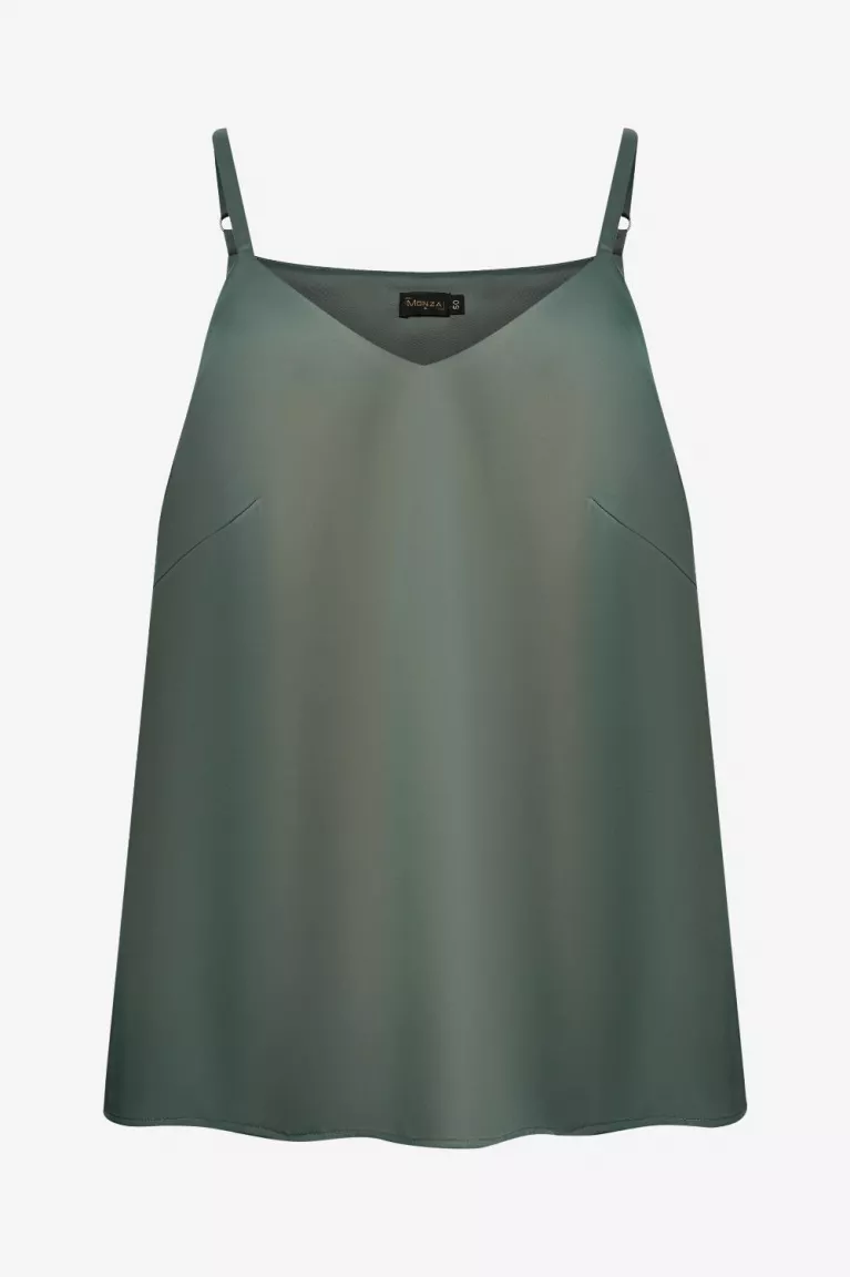 Топ А-силуэта, на тонких лямках из смесовой шелковистой вискозы, в бельевом стиле. Длина до середины бедра. Горловина "V"- образная. Пройма широкая. На переде вытачки для улучшения посадки на фигуру. Верх двуслойный.