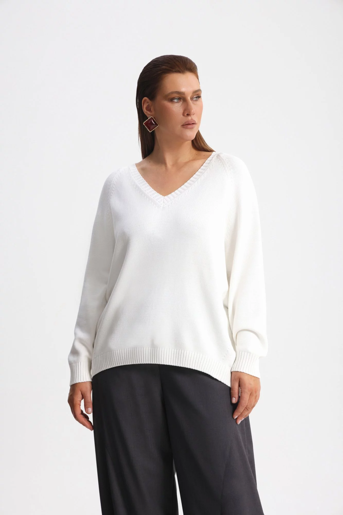 Пуловер оверсайз из вискозного трикотажа. Длина до середины бедра. Горловина V-образная. Рукав реглан, длинный, пройма глубокая.