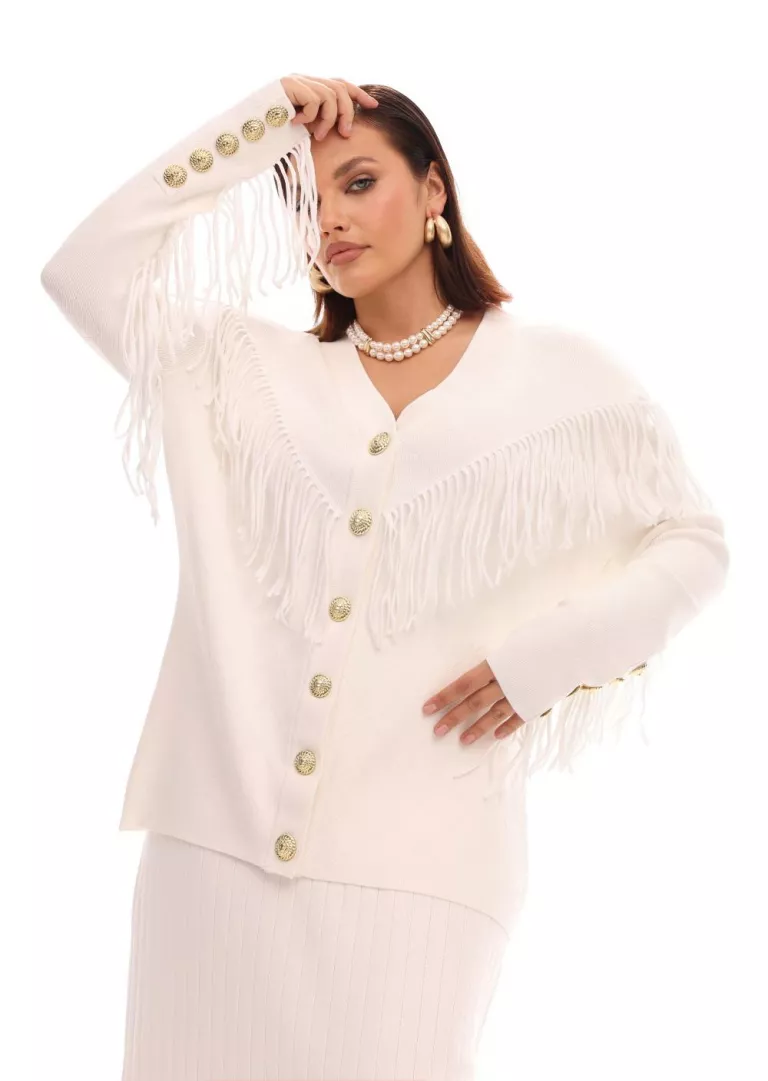 Кардиган прямого силуэта выполнен из плотного трикотажа, что обеспечивает комфорт и тепло в прохладное время года. У него длинные рукава и классический V-образный вырез горловины. Для удобства предусмотрена застежка на пуговицах, а стильная отделка бахромой добавляет акцент образу.