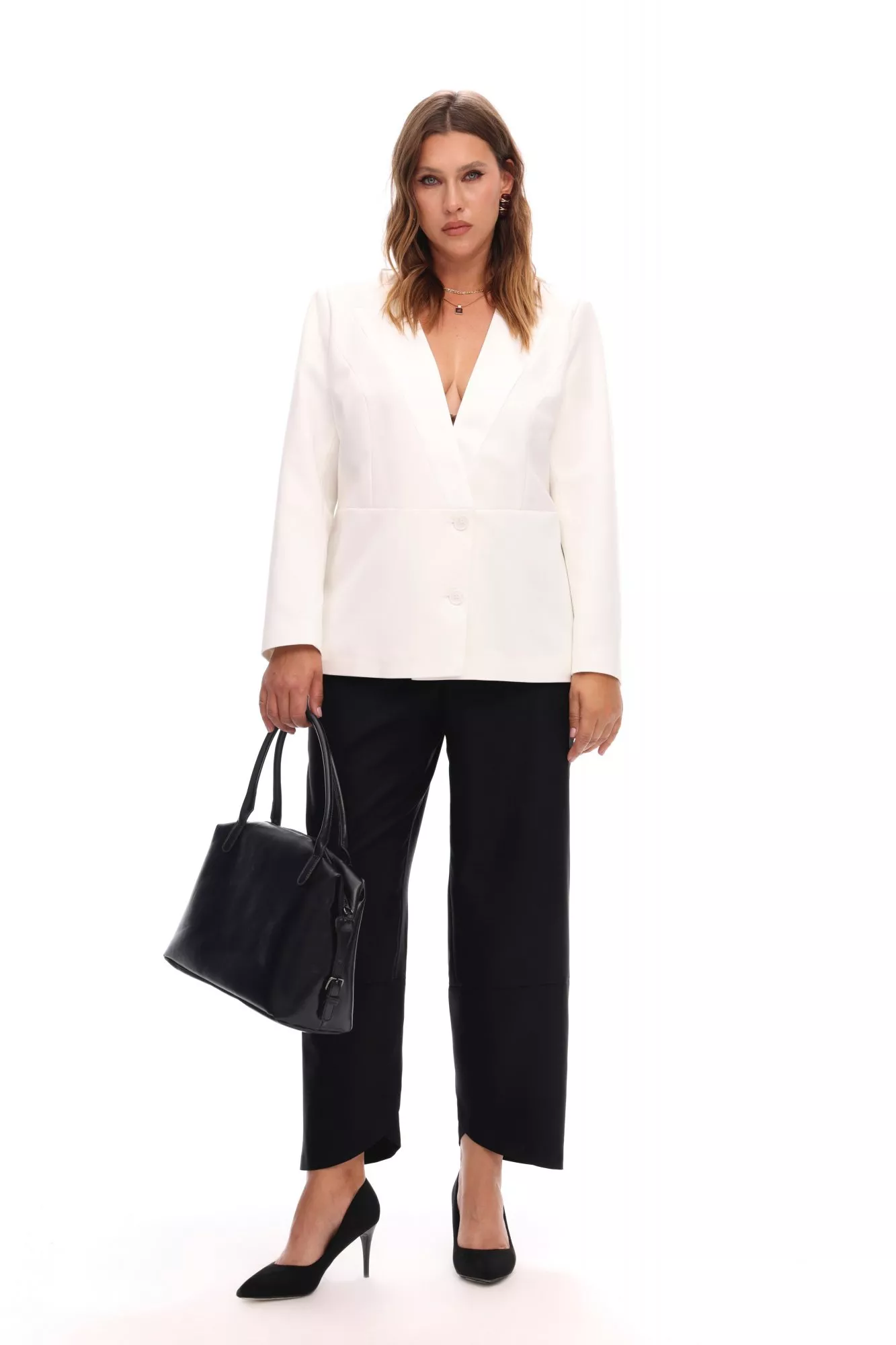 Пиджак однобортный, приталенного кроя смокинг, из смесовой шерстяной ткани. Длина миди. Воротник с атласными лацканами. Спереди и на спинке рельефы и внутренние карманы с клапанами. Рукав длинный, с подплечниками, пройма углубленная. В качестве застежки внутренние пуговицы.