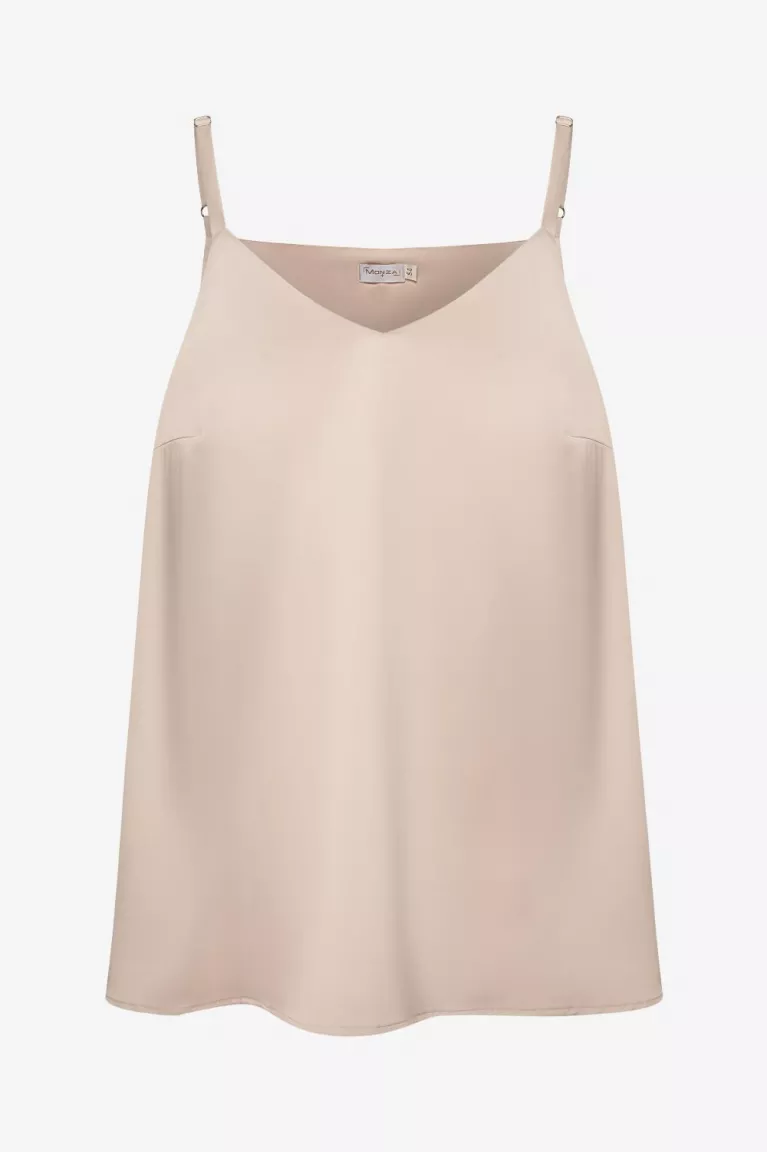 Топ А-силуэта, на тонких лямках из смесовой шелковистой вискозы, в бельевом стиле. Длина до середины бедра. Горловина "V"- образная. Пройма широкая. На переде вытачки для улучшения посадки на фигуру. Верх двуслойный.