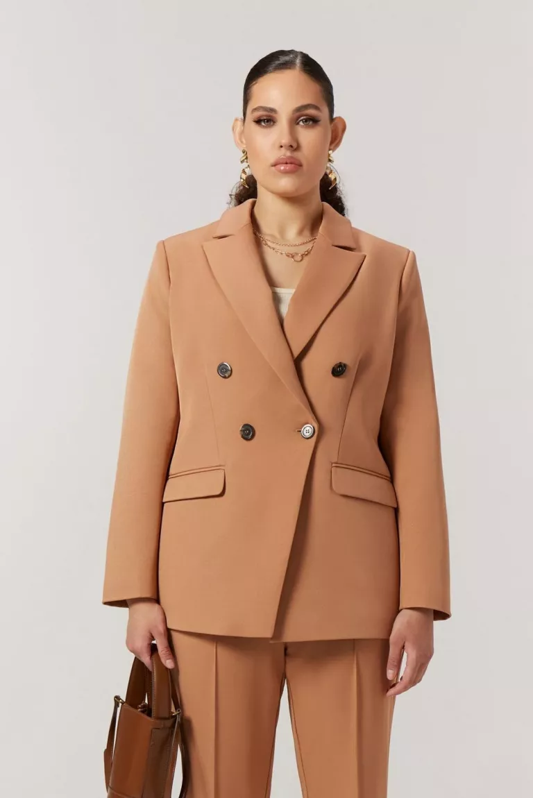 Бежевый двубортный пиджак из облегченной костюмной ткани