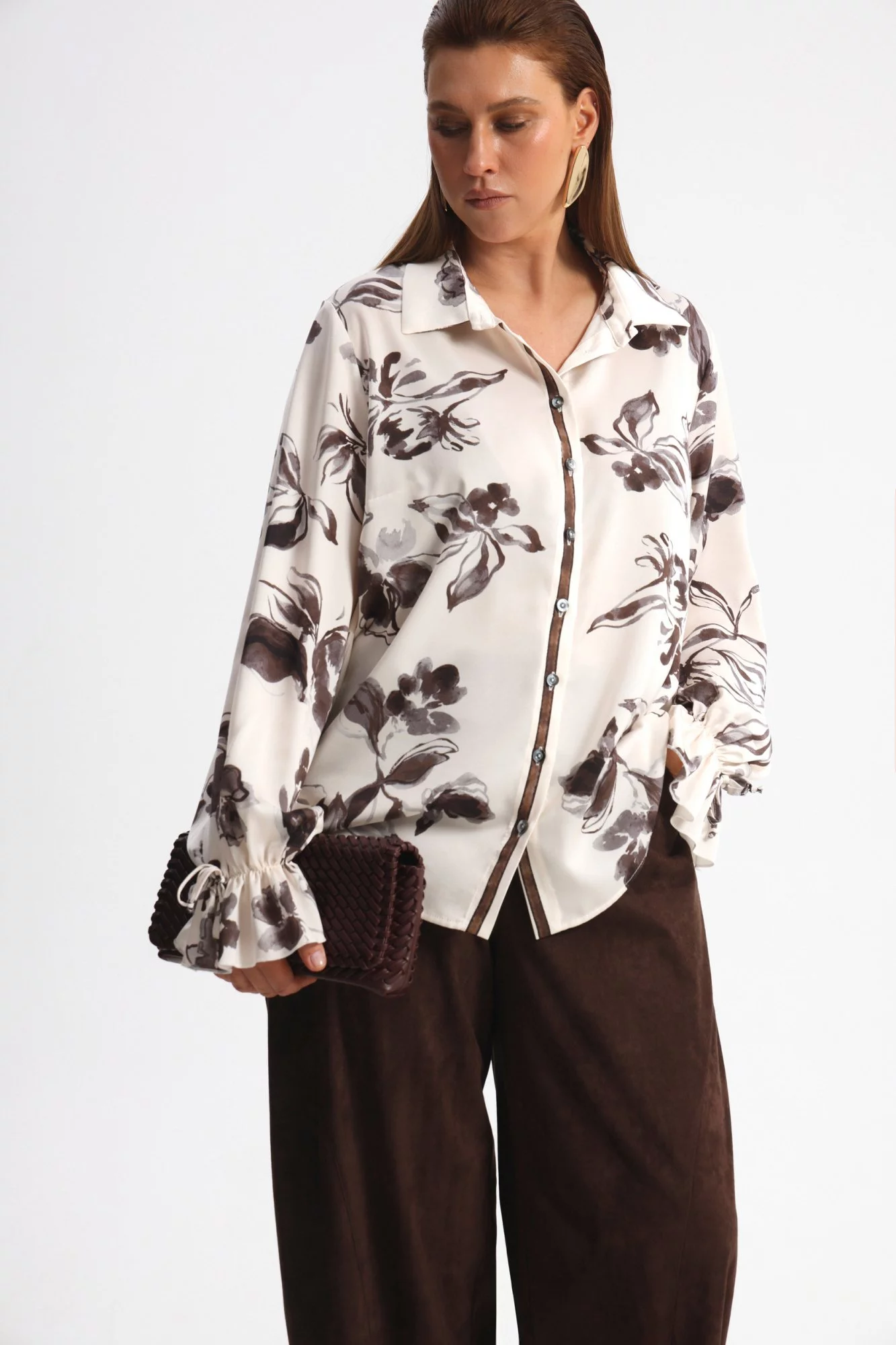 Блузка свободного силуэта, из поливискозы шелковистой фактуры с черным принтом, длина миди. Воротник стояче-отложной. Спереди застежка пуговицы. Длина до середины бедра. Рукав длинный, на отрезной манжете со сборкой и кружевом, пройма широкая.