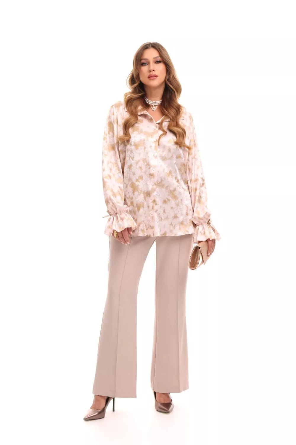 Блузка свободного силуэта, из поливискозы шелковистой фактуры с эффектом хамелеона (шанжан), длина миди. Воротник стояче-отложной. Спереди застежка пуговицы. Длина до середины бедра. Рукав длинный, на отрезной манжете со сборкой, пройма широкая.