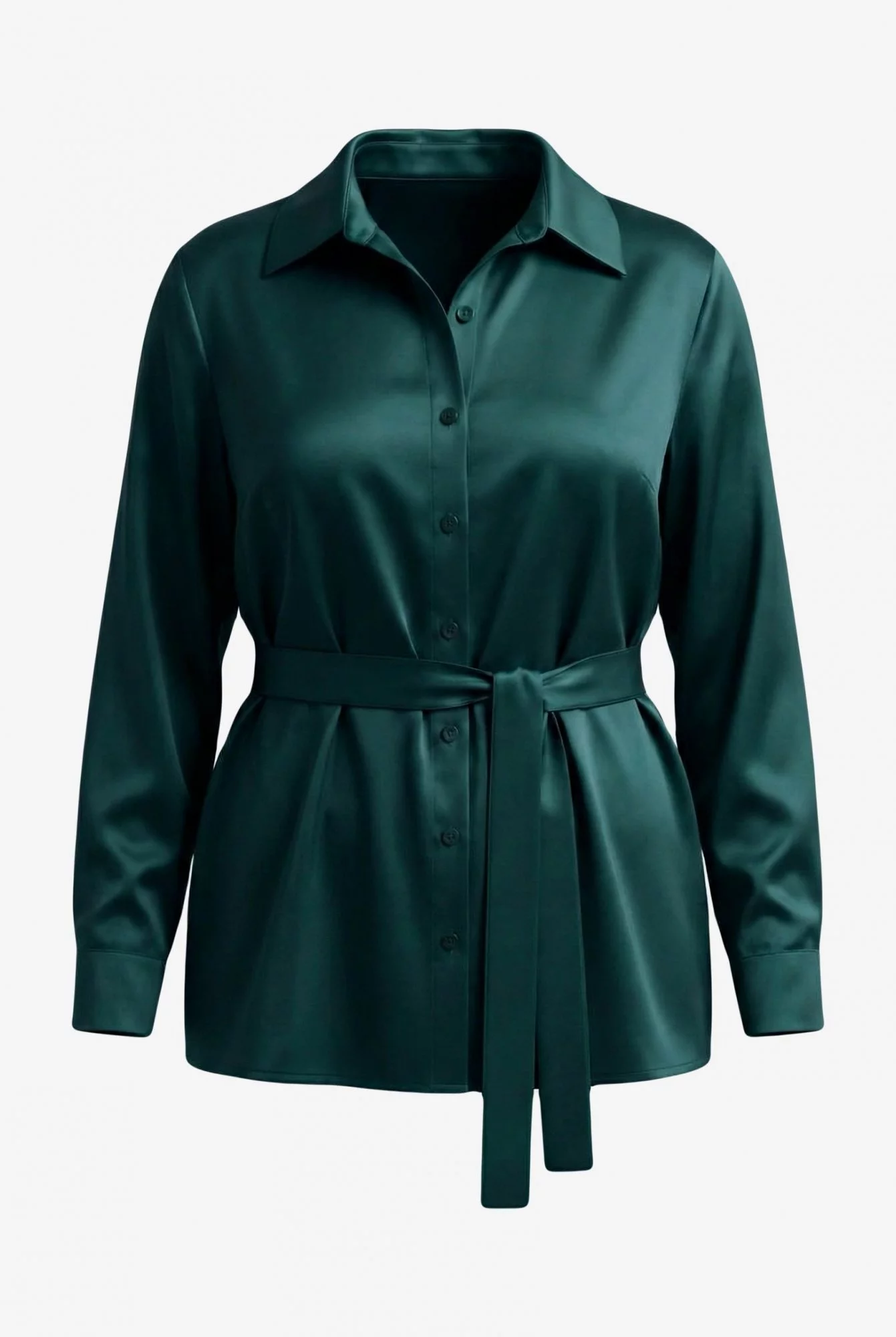 Блузка свободного силуэта, из поливискозы с фактурой шелка, длина миди. Воротник стояче-отложной. Спереди застежка пуговицы. Рукав длинный, на отрезной манжете, пройма широкая. Комплектуется тканевым поясом. Крой relaxed fit отличается достаточным удобством и практичностью. Подобный крой отлично подойдет тем людям, которые хотят иметь определенную свободу при ношении одежды, которая не сковывает движения человека.