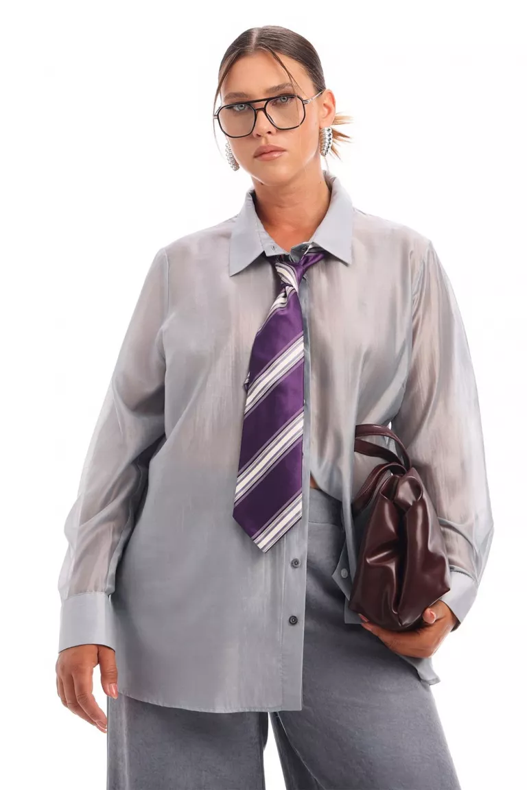 Блузка свободного силуэта, из смесовой вискозы с абстрактным принтом, длина миди. Воротник стояче-отложной. Спереди супатная застежка пуговицы и декоративные пуговицы. Рукав длинный, на отрезной манжете, пройма широкая.
