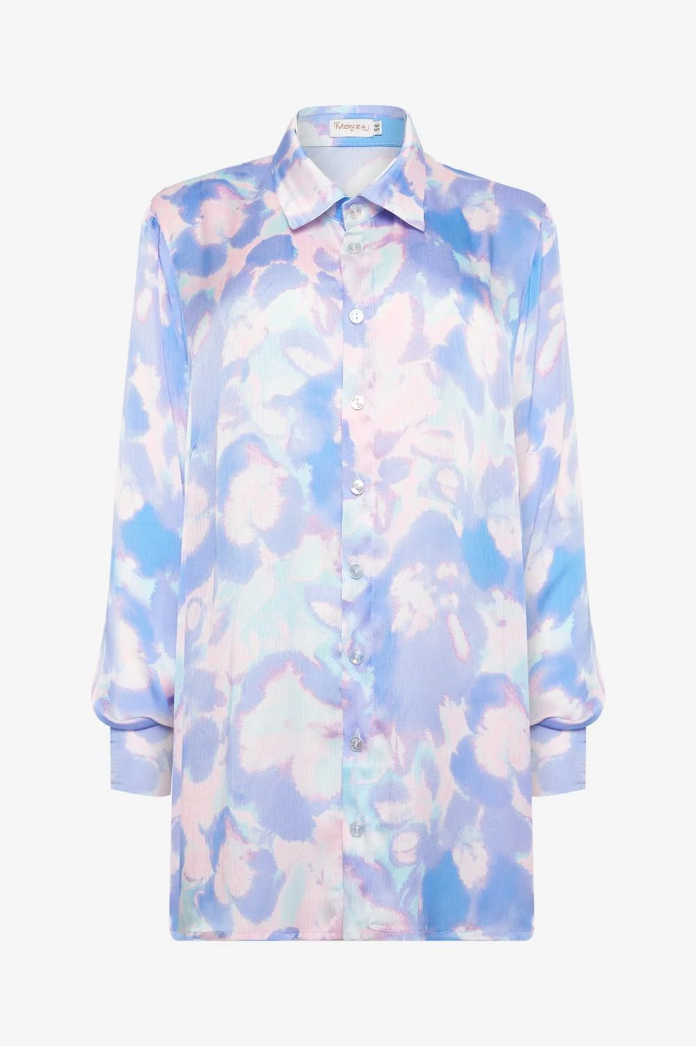 Блузка свободного силуэта, из смесовой вискозы с абстрактным принтом, длина миди. Воротник стояче-отложной. Спереди застежка пуговицы. Рукав длинный, на отрезной манжете, пройма широкая.