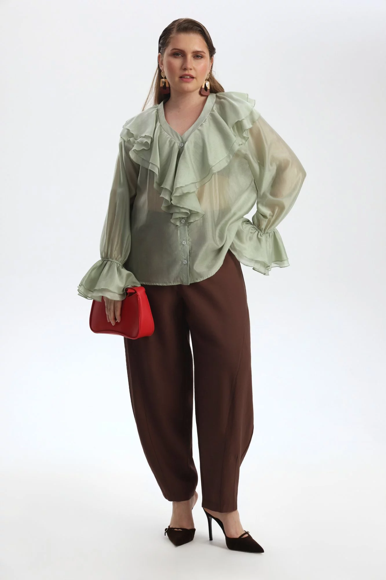 Воздушная блузка свободного силуэта из тенселя. Блузка на пуговицах, в V- вырезом, отделанный воланом. Рукав длинный, объемный, на отрезной манжете с воланом, пройма широкая. Модель миди добавит образу изысканности и стиля. Такой фасон позволит выглядеть элегантно и непринужденно, не ограничивая движения.