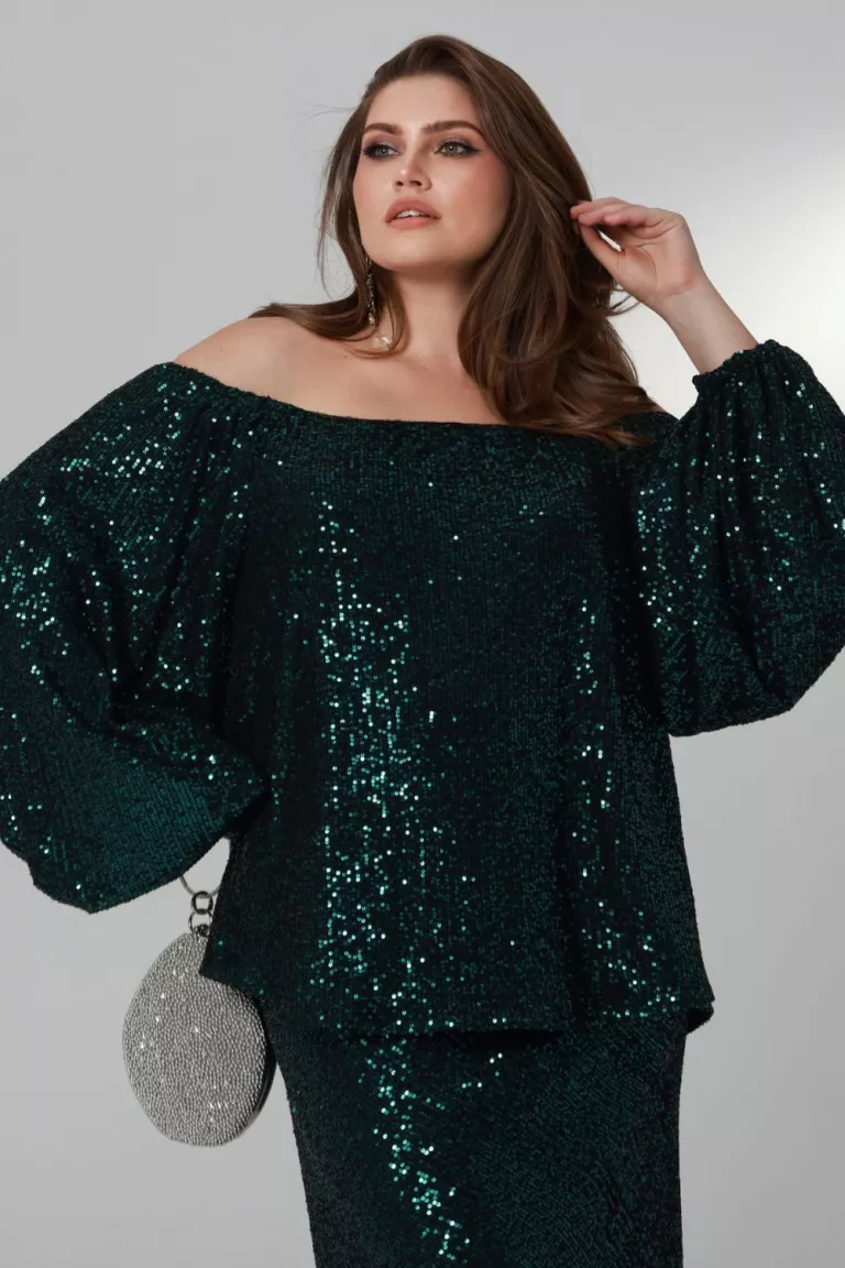 Блузка на подкладке, с пайетками, длина до середины бедра. Вырез лодочка. Рукав реглан, фонарик, пройма углубленная. На груди вытачки.