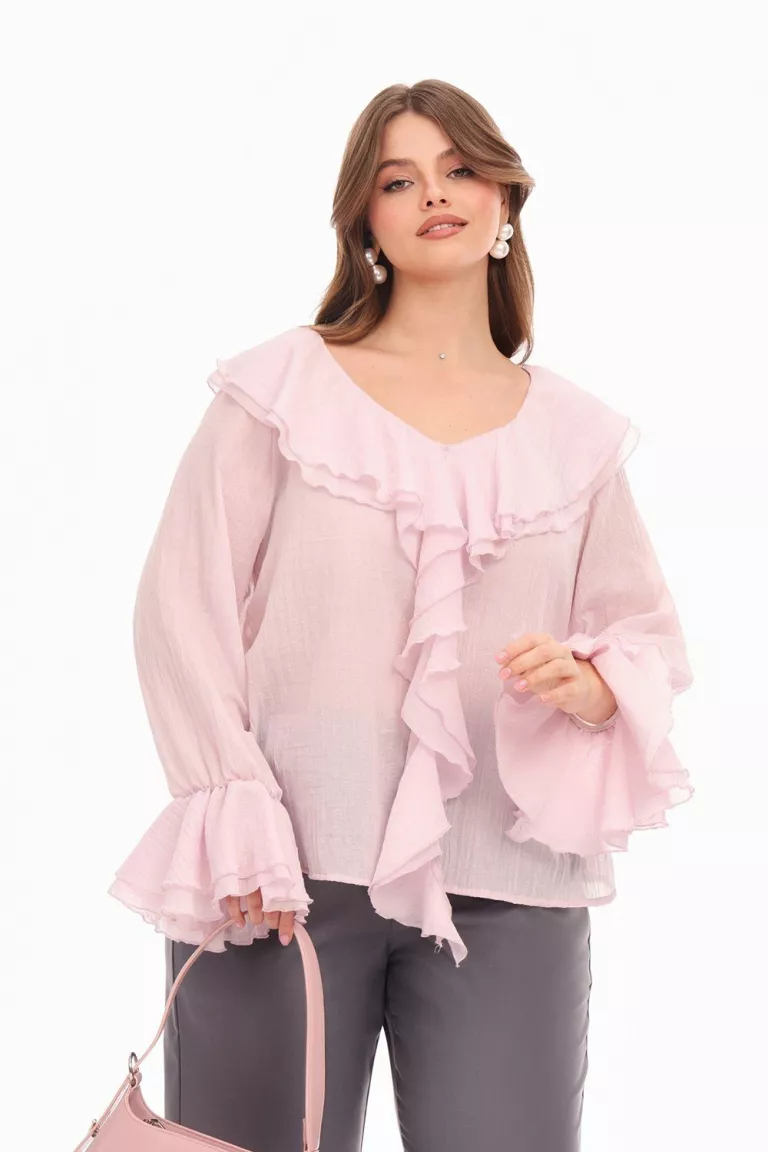 Блузка из тенселя, длина миди. Вырез треугольный, без застежки, отделанный воланом. Рукав длинный, объемный, на отрезной манжете с воланом, пройма широкая.